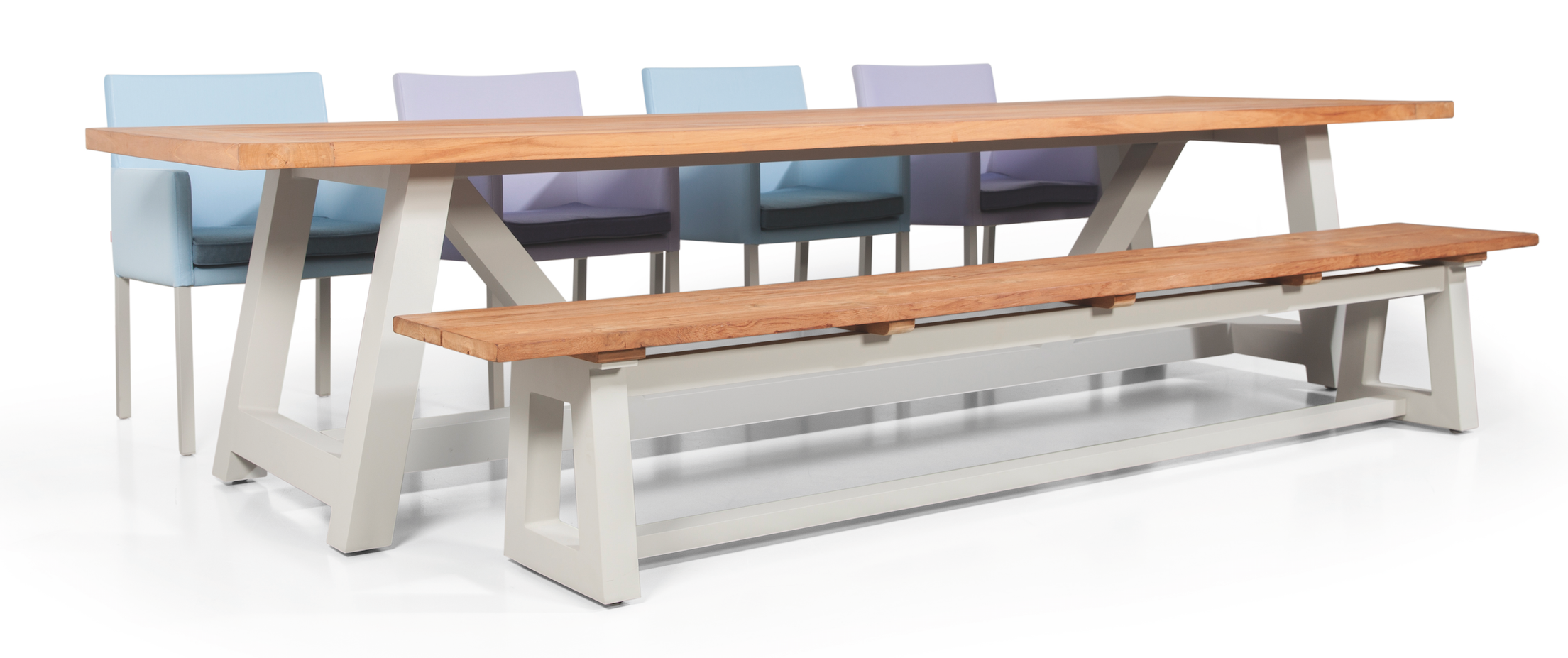Het is een relatief nieuw, maar nu al ontzettend populair item in de tuin: de tuinbank, maar dan als onderdeel van de eettafel-set. Een bank om gezellig naast elkaar te zitten; groot en klein. Een bank ook die qua vormgeving e?e?n op e?e?n aansluit bij de tafel en zo het beeld versterkt. Zowel de tafel Bolano als Trento hebben een bijpassende, lage bank; met dezelfde aluminium poten als de tafel en een teakhouten zitting.