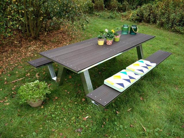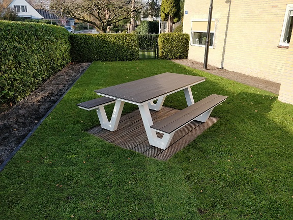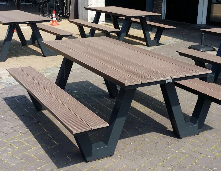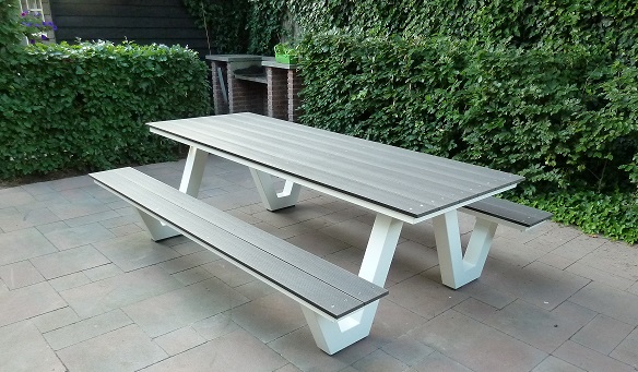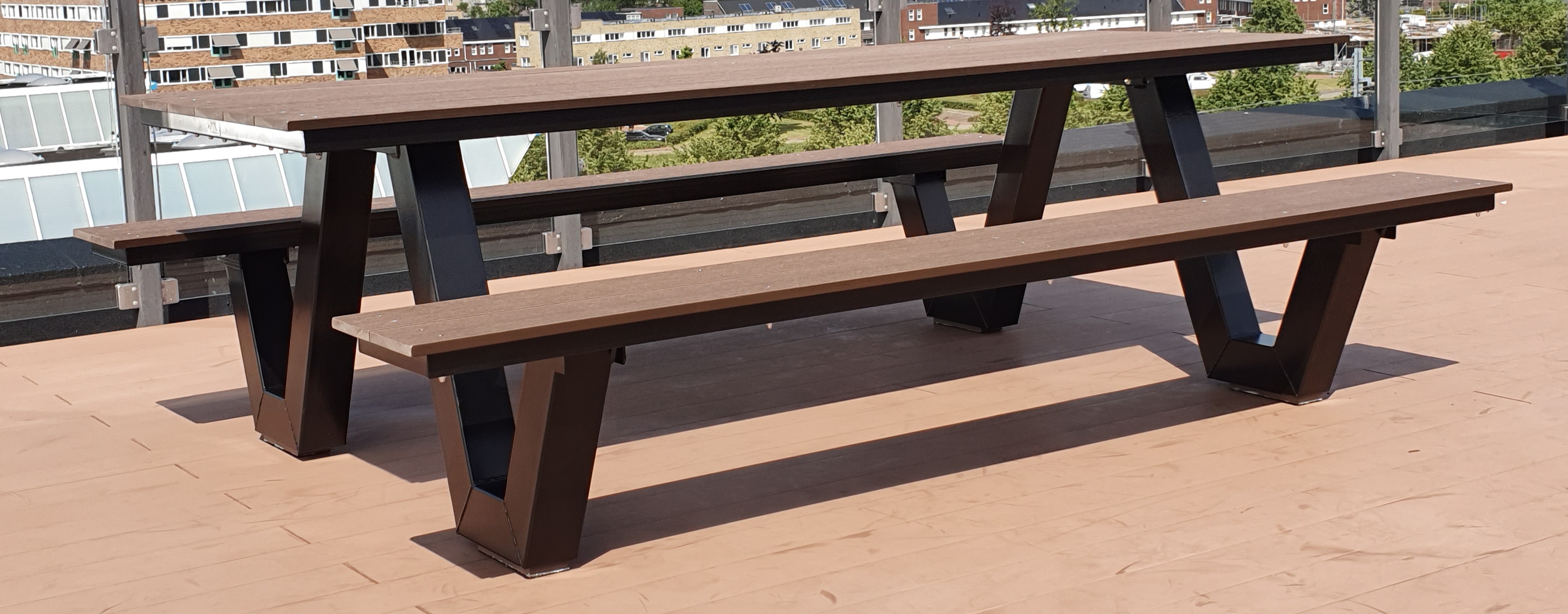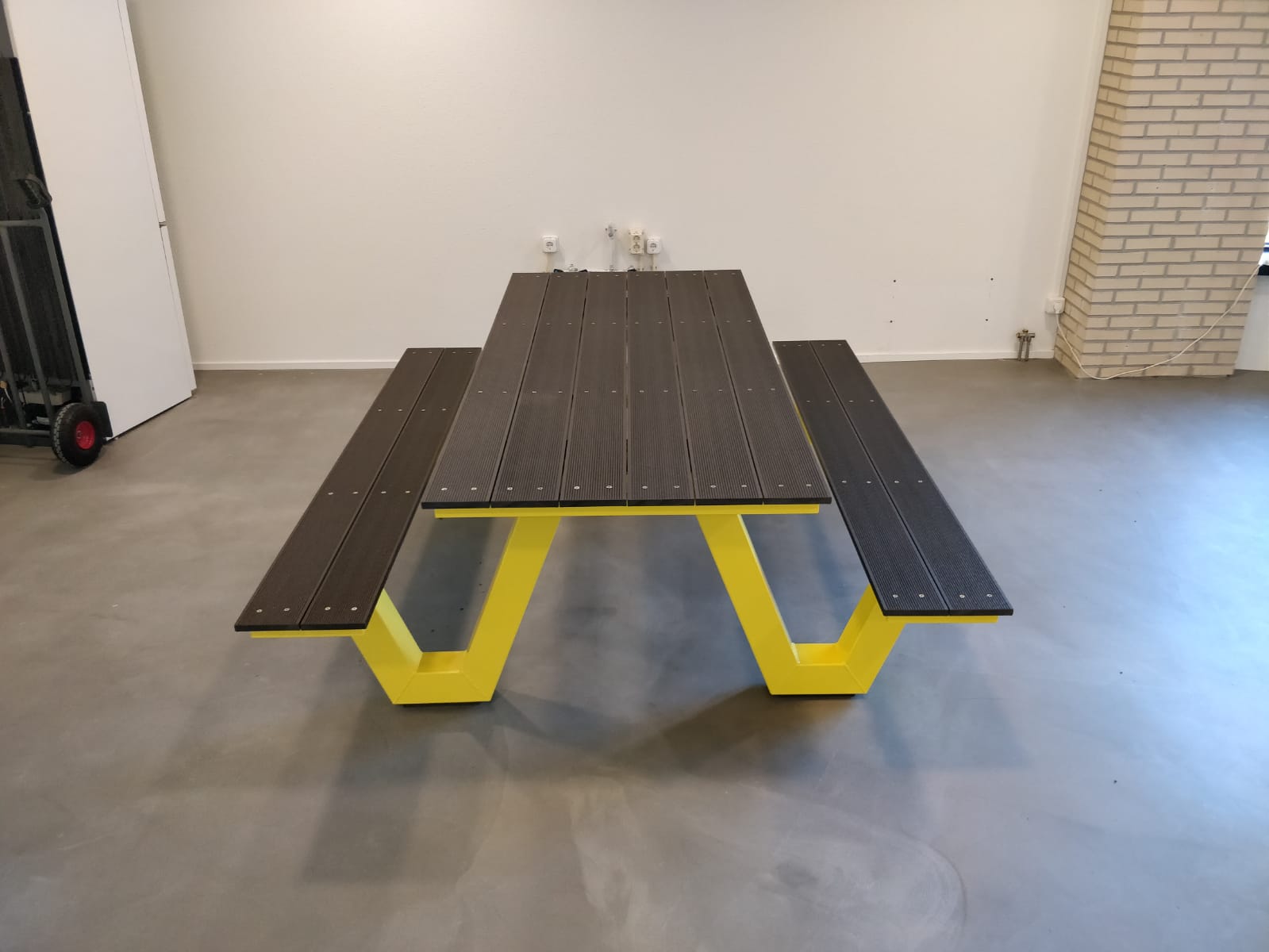 Picknicktafel van zware kwaliteit. Onderstel is verzinkt. Coaten kan in elke Ral kleur. De planken zijn van houtcomposiet, keus uit 4 kleuren.