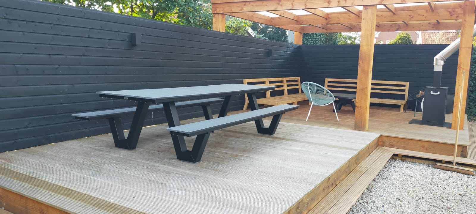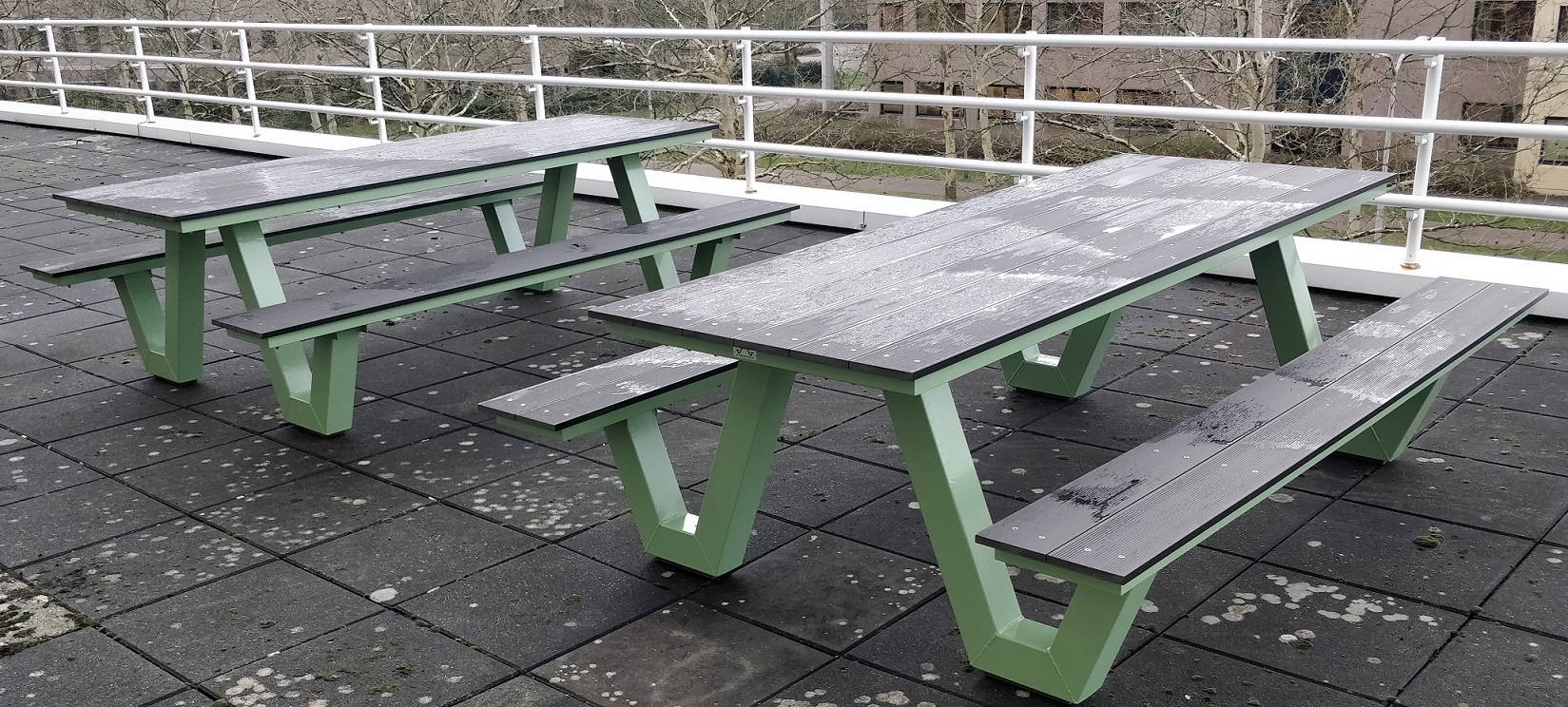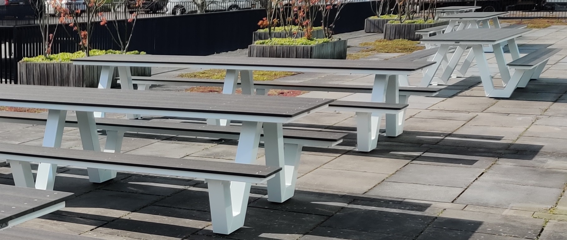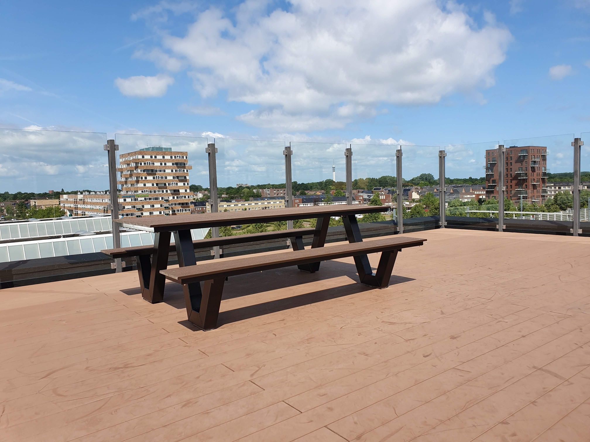 Picknicktafel van zware kwaliteit. Onderstel is verzinkt. Coaten kan in elke Ral kleur. De planken zijn van houtcomposiet, keus uit 4 kleuren.