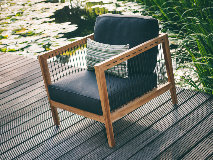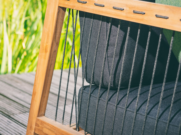 Een voorbeeld van een exclusieve design set gemaakt met rope is de La Croix loungeset. Net als bij een mooi maatkostuum is het ‘stiksel’ van de La Croix loungeset in een afstekende kleur zichtbaar op het naturel teakframe verwerkt. Het rope in deze stijlvolle set is kunstig door het hout geregen, waardoor er een transparante, open structuur ontstaat en je als het ware ‘door’ het meubel heen kijkt.
