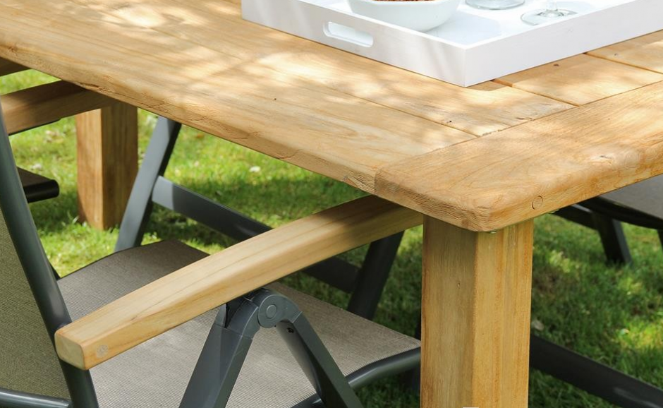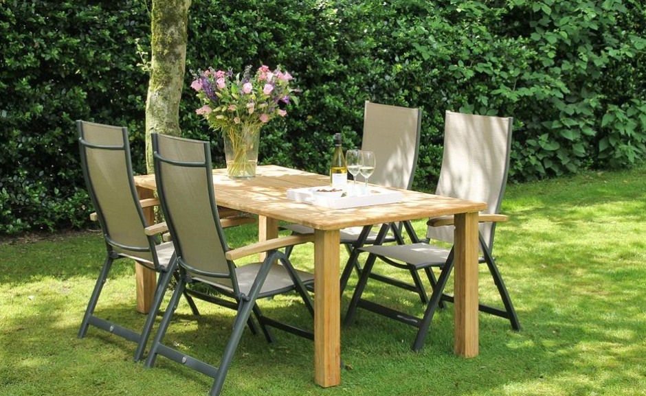 Aan deze royale eetset van hoogwaardig aluminium geniet u met familie en vrienden van uw tuin. Deze eetset van Fonteyn heeft een mooie natuurlijke uitstraling door de Leonardo stoelen met een zitting van sunbrella, een weersbestendig materiaal met een zachte structuur, waardoor het prettig aanvoelt. De stoel is verstelbaar in 5 standen en afgewerkt met mooie teakhouten armleuningen. Ook de royale eettafel is gemaakt van herbruikt teakhout, waardoor u de bossen spaart en een tafel met karakter in uw tuin heeft.