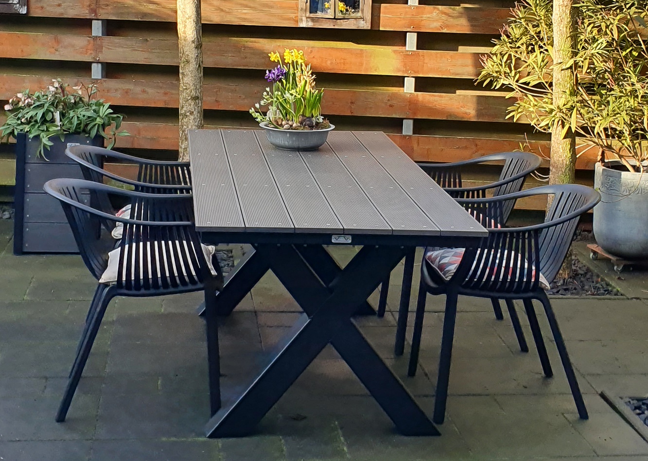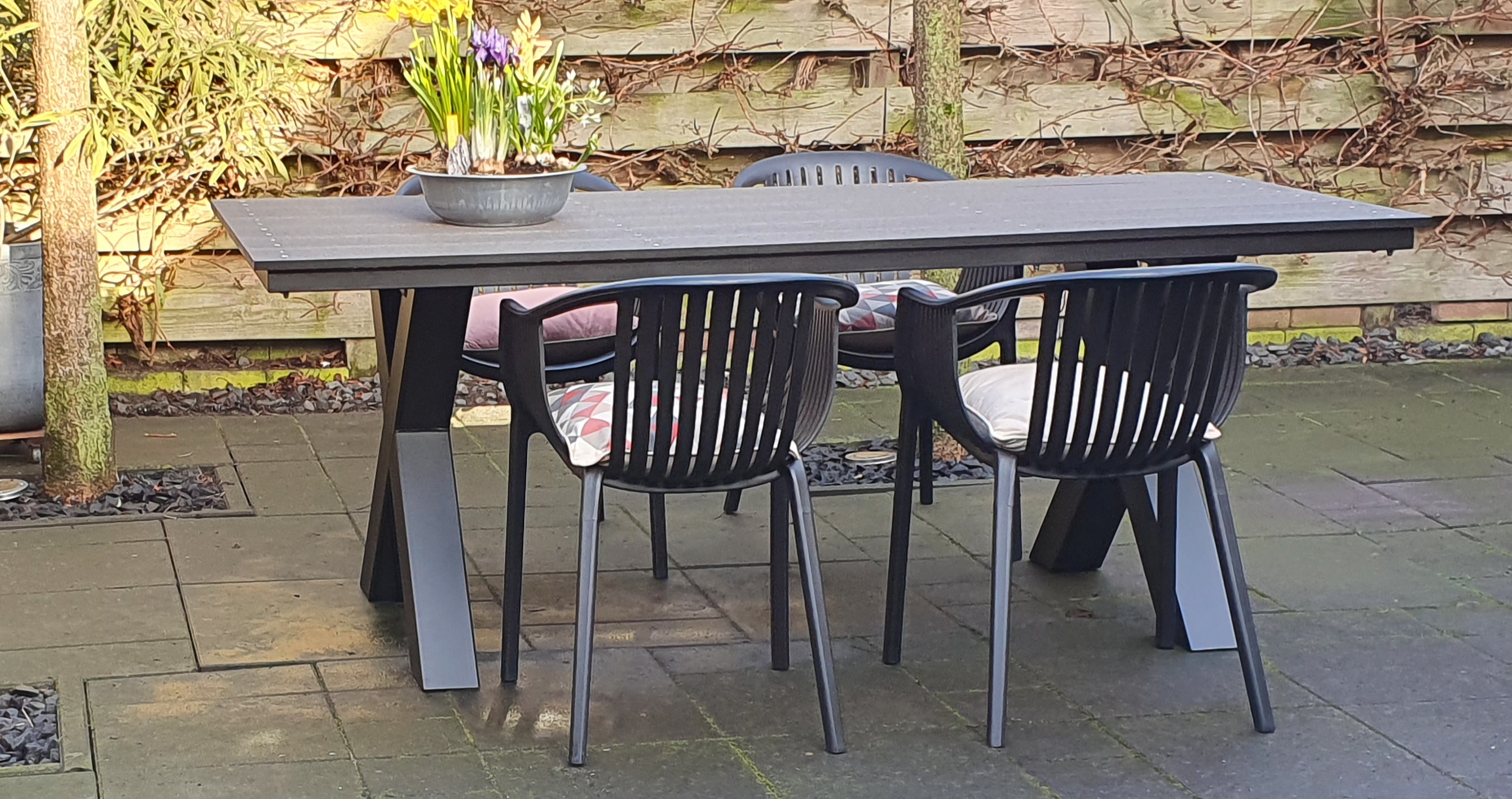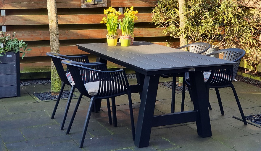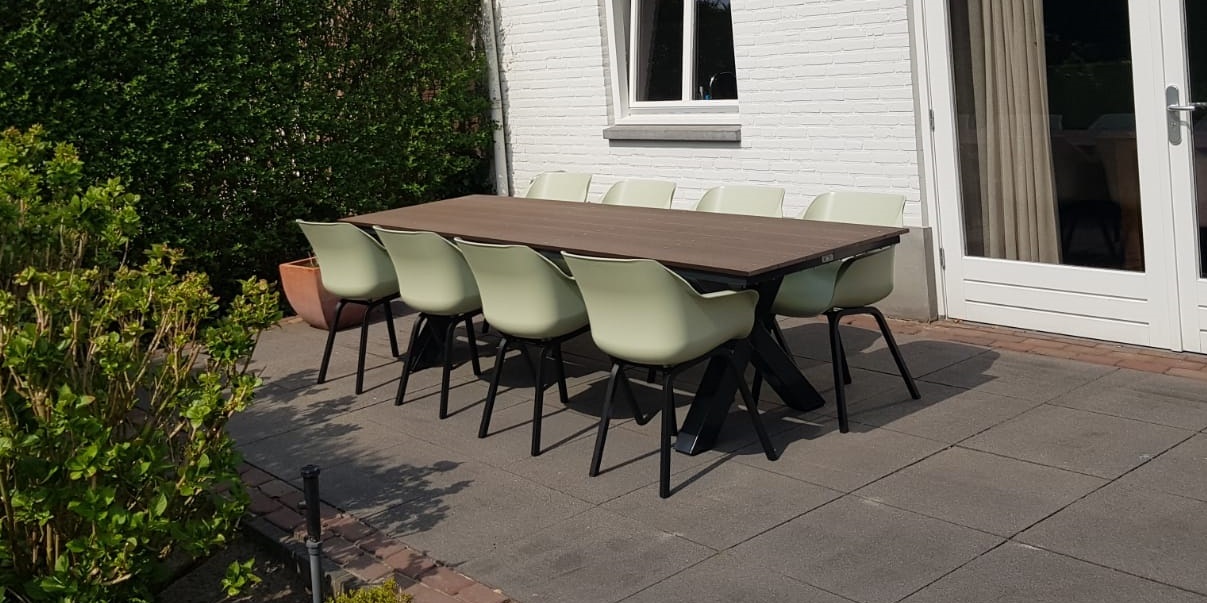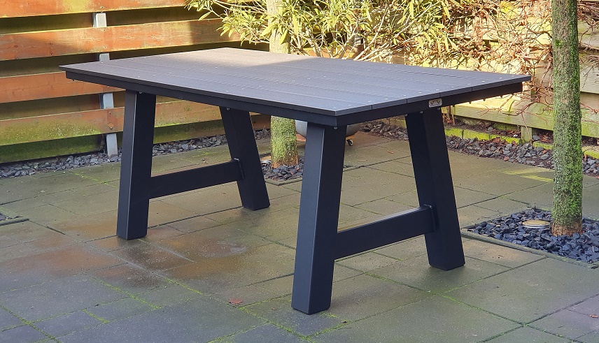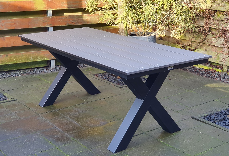 Moderne tuintafel maar dan onderhoudsarm. Staal met composiet planken. Keus uit kruispoot of A-tafelpoot. Optioneel ook in andere kleuren en/of verzinken.