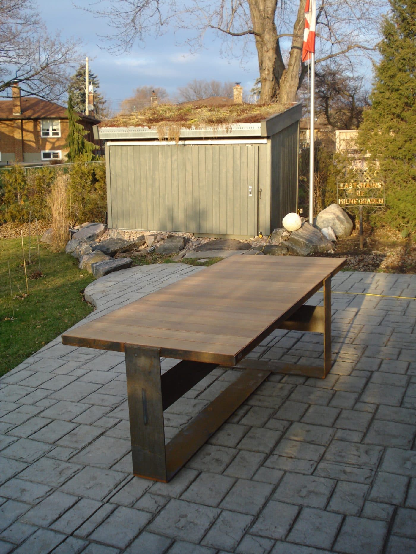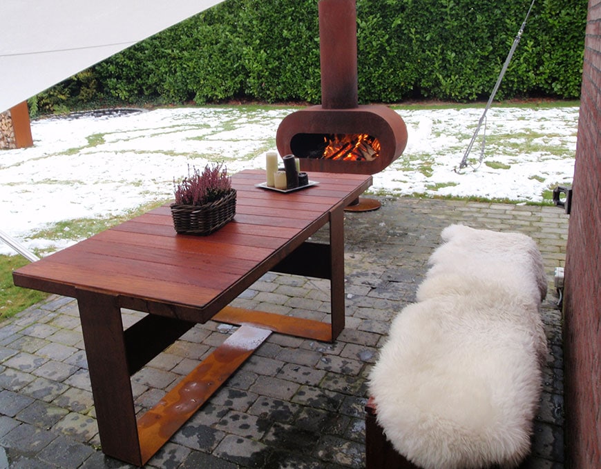 Kleur onbehandeld van oranjebruin tot aubergine. De Zeno Table kan indien gewenst geleverd worden in elk gewenste RAL kleur of in behandeld blauw staal.