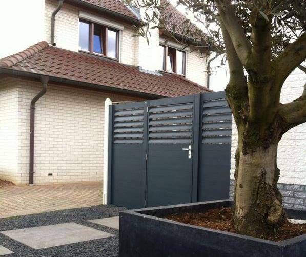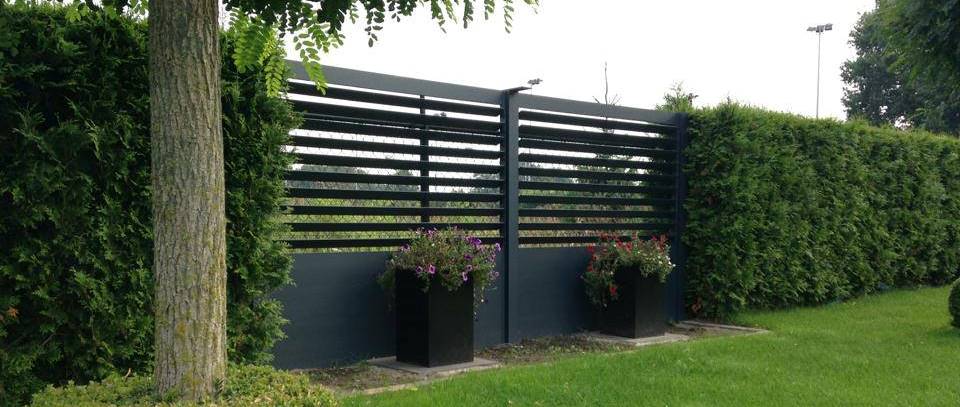 Aluminium lamellenscherm schutting. Geef je tuin meer sfeer . Door het verdraaien van de lamellen geeft u de doorkijk die u graag wil hebben.
