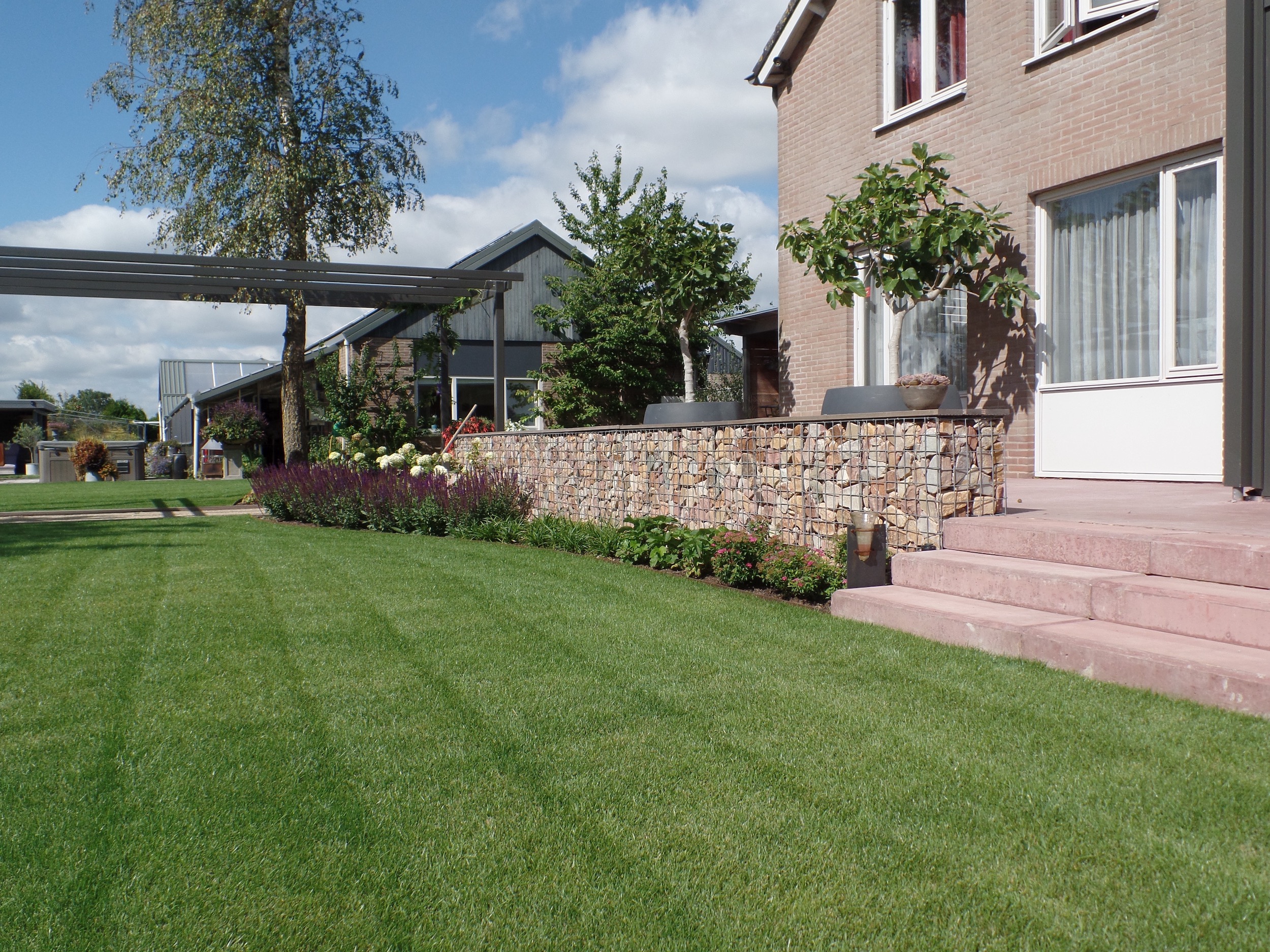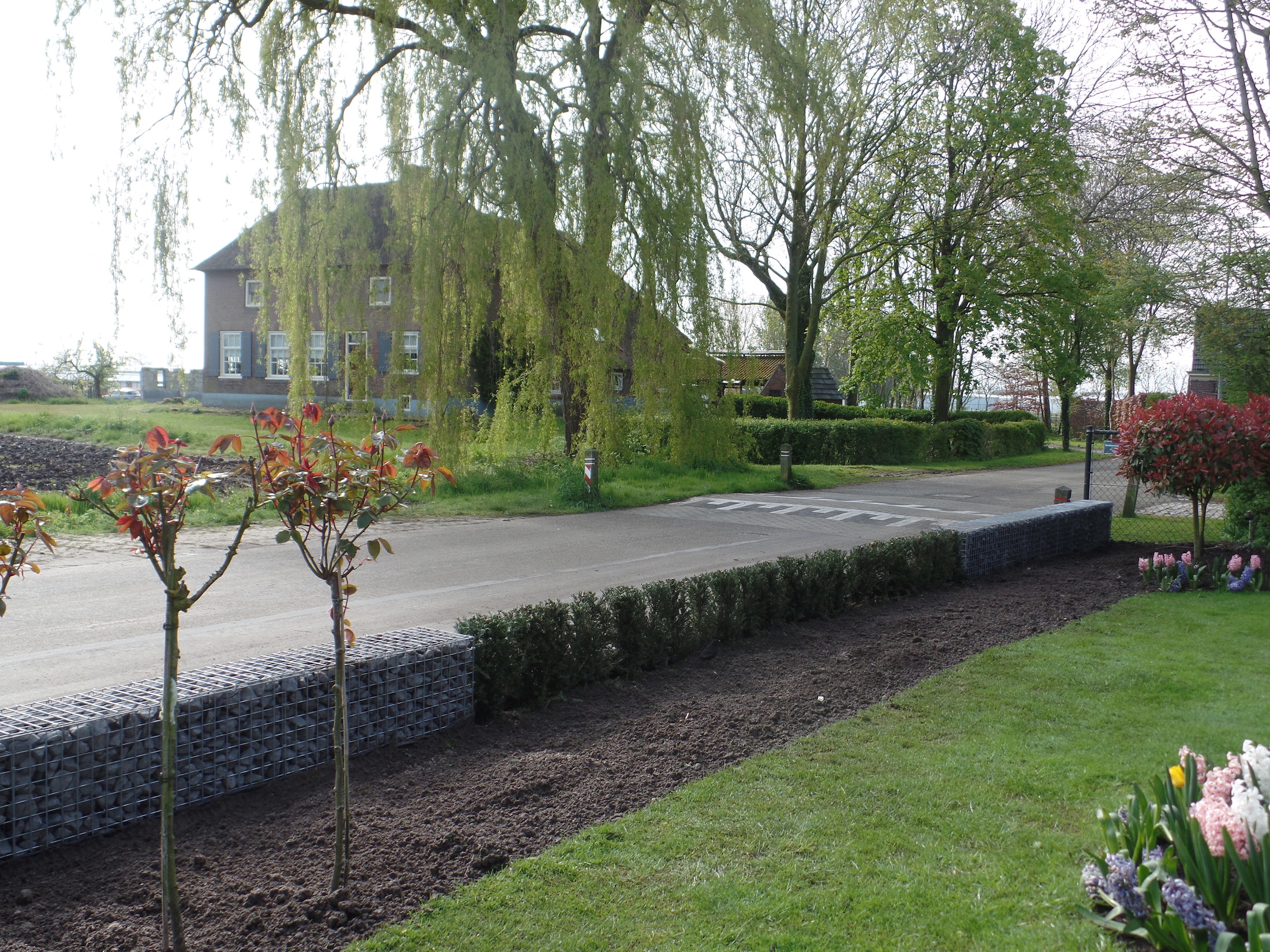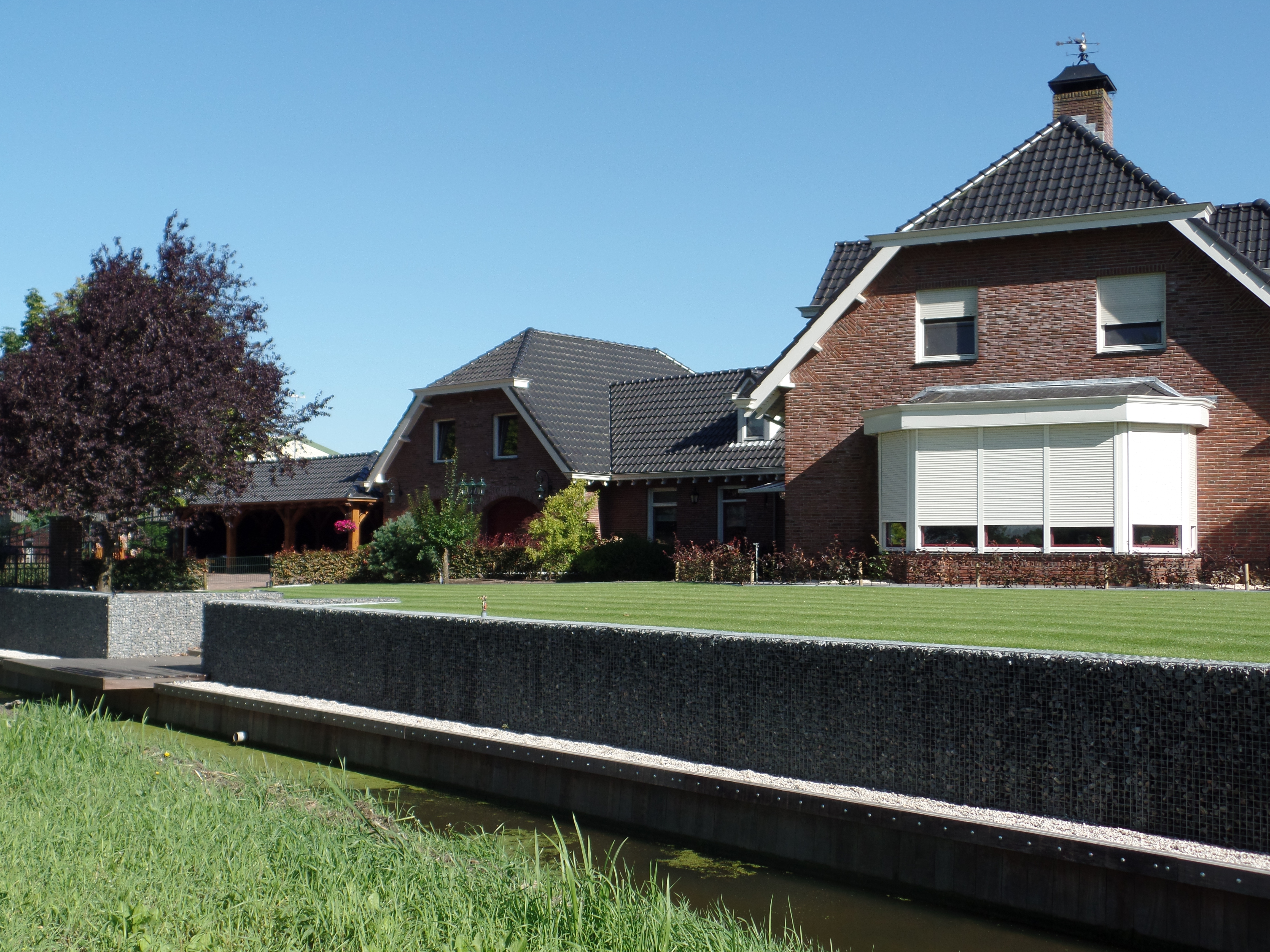 Een golfvormige schanskorf vervangt de oude heg en vormt nu een moderne tuinafscheiding langs de sloot. Met beplanting ontstaat een natuurlijke, duurzame uitstraling.