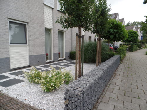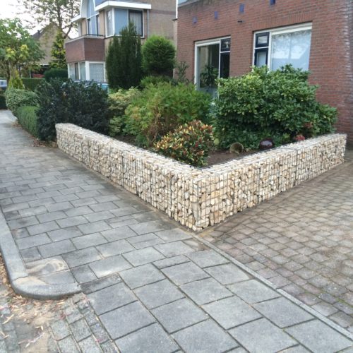 Met een erfascheiding van schanskorven ben je flexibel in de kleur en maatvoering. Voordeel van een steenkorf is dat er nagenoeg onderhoud nodig is.