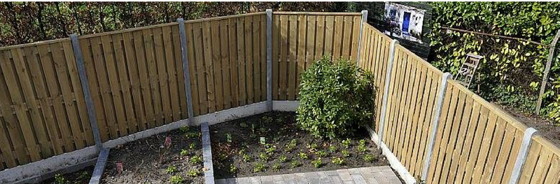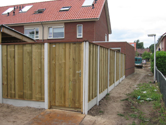 hout/beton schutting 12 x 12 systeem: bij deze schutting worden betonpalen van 12 x 12 cm. dikte geleverd. Hiertussen kunnen houten dichtschermen of tuinschermen met 24 planken geleverd worden.