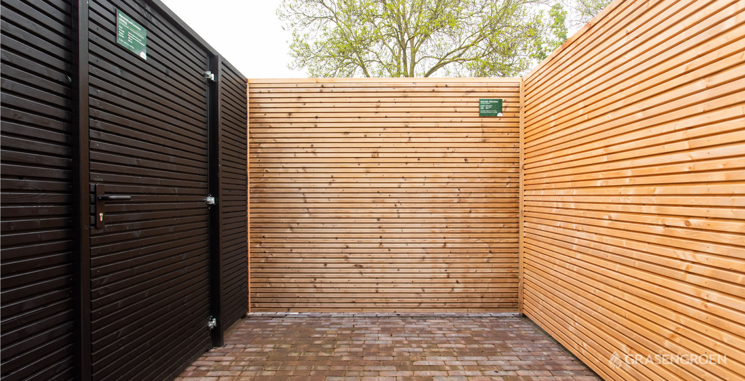 De meeste sjieke uitvoering van de rabat schuttingen is ongetwijfeld de dubbele rhombus schutting. Het ruitvormige profiel is mooi, maar het thermische behandelde Ayous en Fraké Noir maken deze schutting echt tot een plaatje. Deze houtsoorten vergrijzen op een prachtige wijze.