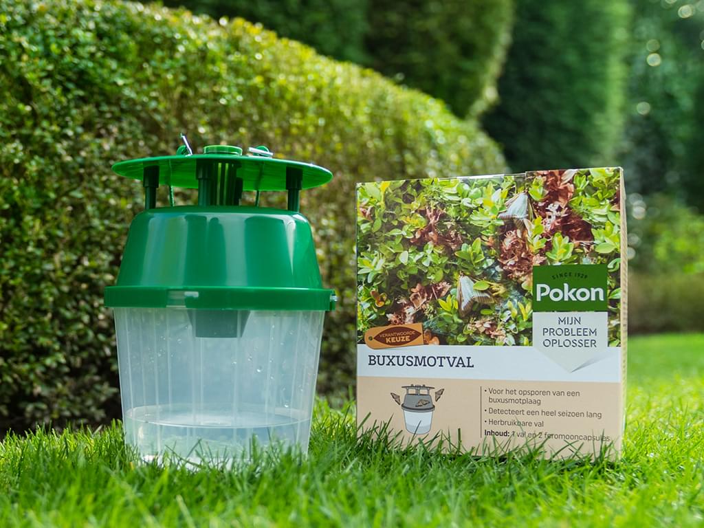 De Pokon Buxusmotval (€39,95) en navulverpakking (€9,99) zijn verkrijgbaar bij tuincentra, bouwmarkten en online verkooppunten. Kijk voor meer informatie op www.pokon.nl.