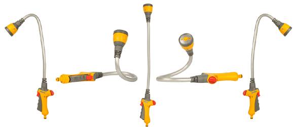 De Flexispray is uitgerust met een multifunctionele sproeikop met 4 sproeistanden. Door de sproeikop te draaien veranderd het sproeipatroon van een snelvulstand voor het vullen van bijvoorbeeld een emmer of kinderbadje in een harde straal om gericht kleinere oppervlakken schoon te spuiten van kleinere oppervlakten of in een broes voor het bewateren van bloemen en planten zonder opspattend water. De laatste sproeistand tenslotte is speciaal voor als u de Flexi spray wilt gebruiken als gazonsproeier.