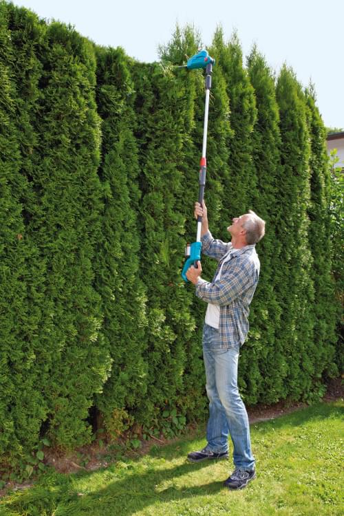 Om een hoge haag eenvoudig te snoeien introduceert GARDENA de accuheggenschaar THS Li. De uitschuifbare steel kan daarbij een bereik van 3 meter halen. Het geringe gewicht (3,2 kg) zorgt voor een goede controle vanaf de grond. Net als de nieuwe accustokzaag is de heggenschaar voorzien van een kantelbare kop. Daarom kun je zonder bukken ook eenvoudig bodembedekkers of lage hagen snoeien.
