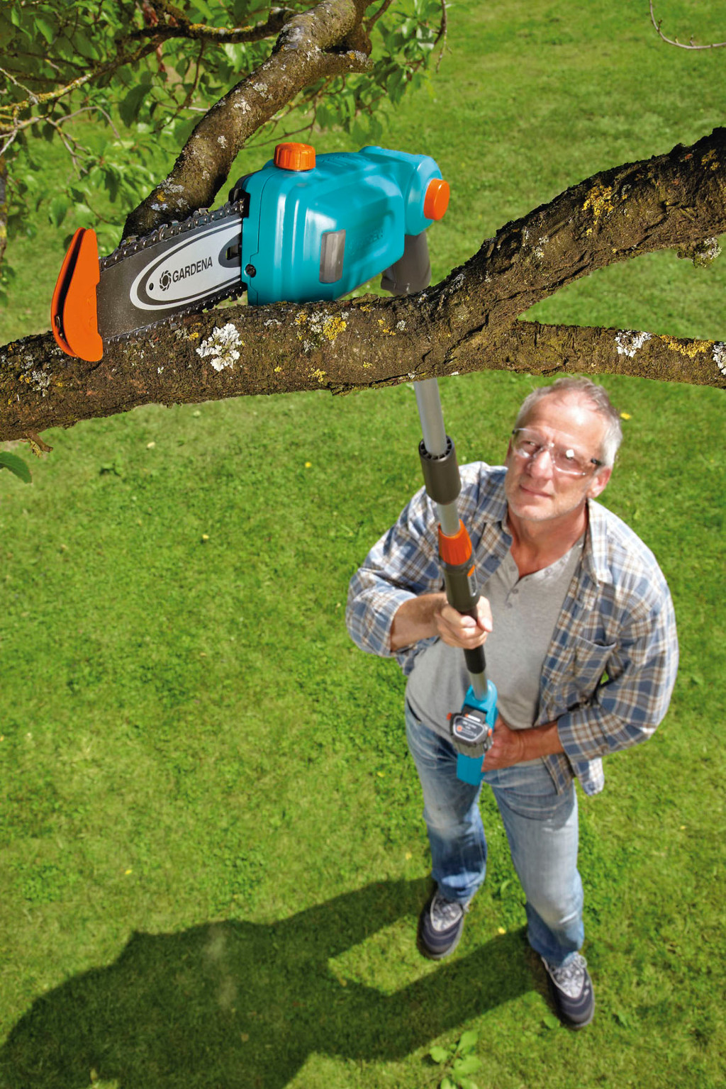 Veilig snoeien op hoog niveau met de GARDENA accustokzaag TCS Li en de accuheggenschaar THS Li.