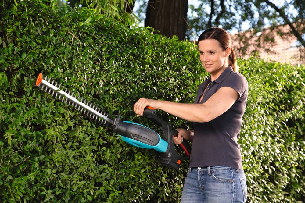 Door een uitgebalanceerd gewicht liggen de heggenscharen goed in de hand. De rechthoekige, draaibare messenbalk zorgt voor een ideale en ontspannen werkhouding. De nieuwe elektrische heggenscharen zijn ook verkrijgbaar als accumodellen. De (lithium-ionen) accu is uitwisselbaar en ook te gebruiken voor ander GARDENA gereedschappen bijvoorbeeld de (lithium-ionen) accu gazontrimmer.
