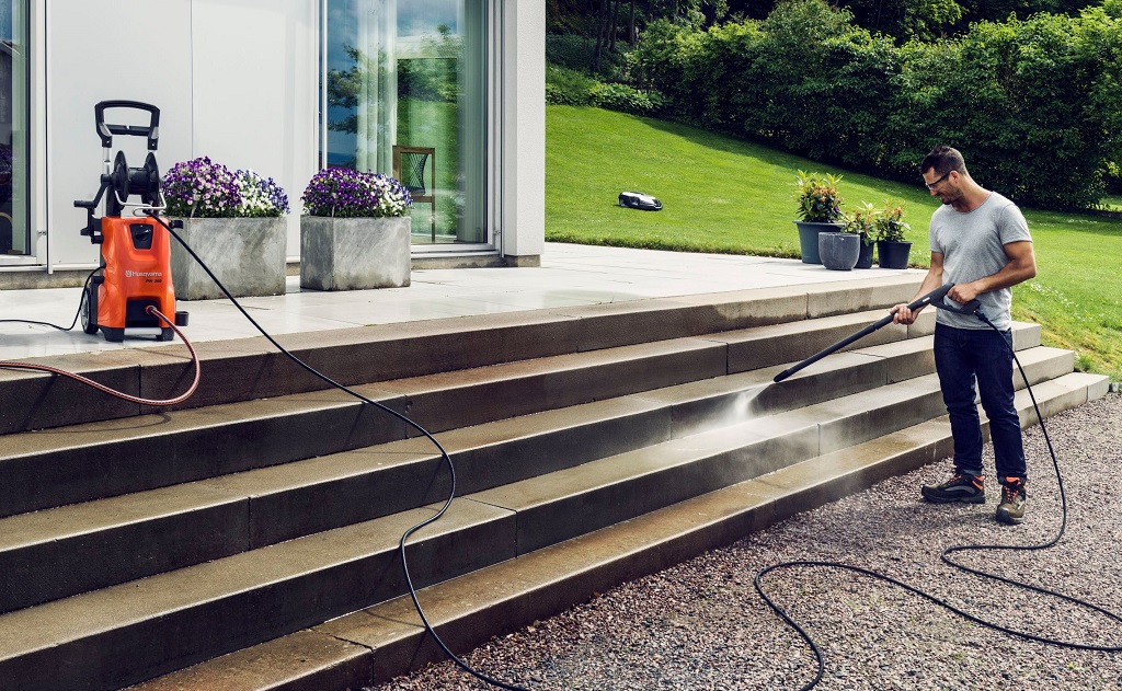 De hogedrukreiniger van Husqvarna is zeer compact. De spuitlans, slang, elektriciteitskabel, mondstukken en schuimspuit worden op de machine zelf opgeborgen. Het apparaat is soepel voort te bewegen door de grote wielen en de telescopische draaghandgreep. Die pas je eenvoudig aan op de eigen lichaamslengte. De lange spuitlans voorkomt bukken en op ladders klimmen en zorgt voor een goede werkhouding. De draaikoppelingen voorkomen dat de extra lange, flexibele hogedrukslang (tot 15 meter) onverhoopt verstrikt raakt. Elke hogedrukreiniger is standaard uitgerust drie opzetstukken: een schuimspuit en twee mondstukken. Het ene mondstuk met platte straal is voor normaal gebruik, het andere met roterende straal is om hardnekkig vuil te verwijderen. De schuimspuit is bedoeld voor reinigingsmiddel dat gedoseerd wordt afgegeven.