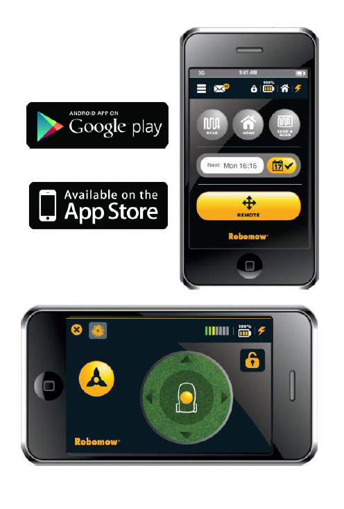 De Robomow-app is exclusief ontwikkeld voor de 2014-modellen en is kosteloos te downloaden. Met de Robomow-app kan de gazonmaaier op afstand worden bestuurd, ingesteld, gevolgd en worden geprogrammeerd. De smartphone of tablet staat met de Robomow in verbinding via een Bluetooth-verbinding. De Robomow-app maakt zo van de smartphone of tablet een handige afstandsbediening. De Robomow kan daarmee eenvoudig worden verplaatst en lastige hoeken in het gazon zijn beter te onderhouden. Een uitzondering op het maaischema, voor bijvoorbeeld een kinderpartijtje op woensdagmiddag, laat zich eenvoudig invoeren. Een blik op het scherm toont de voortgang van het maaiwerk. Zelfs het hele programma is vanaf de Robomow-app aan te passen.