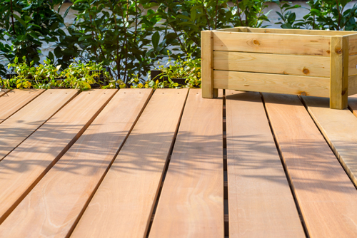 Ipe; tropisch hardhout, luxe uitstraling, neemt weinig vocht en vuil op, duurzaam.
