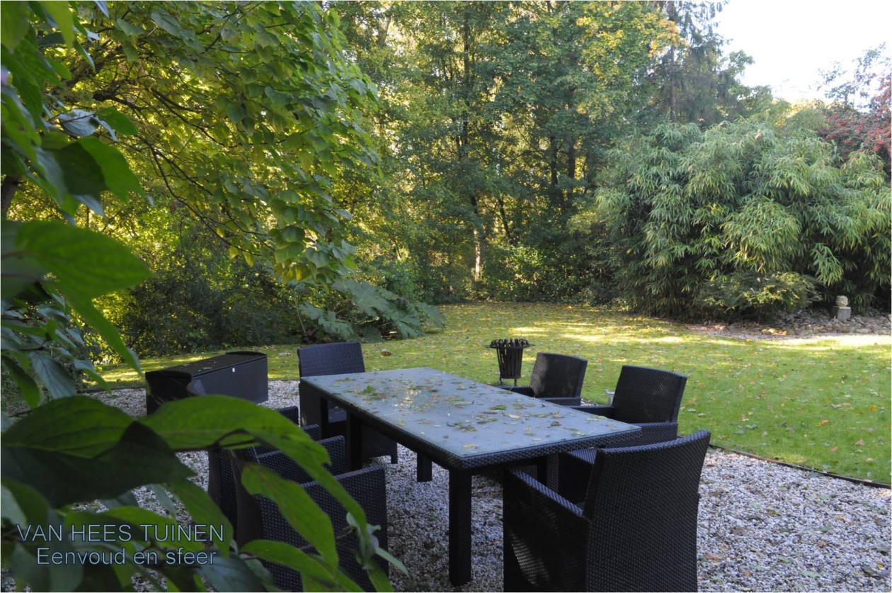 De bomen en hagenstructuur zijn over 30 jaar nog aantrekkelijk. Een bloemenborder van sterke langbloeiende planten.