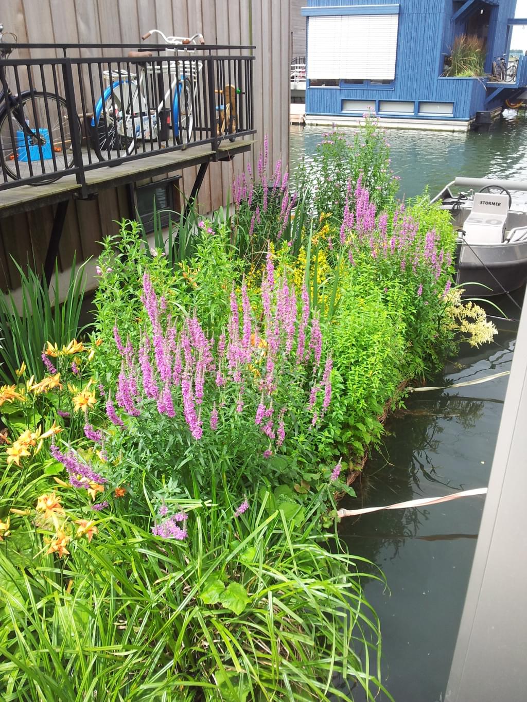 Een moes- of kruidentuin. Uitzicht op een kleurig struikgewas. Een grasveld om heerlijk op te luieren. De oplossing: een drijvende tuin: een echte tuin, drijvend op water.