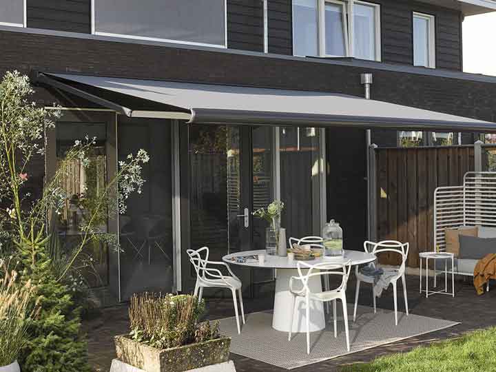Zonneschermen – ook wel knikarmschermen genoemd - zijn in brede afmetingen te leveren, in veel doekkleuren samen te stellen en in diverse prijscategorieën ingedeeld. Kies je voor een open of gesloten cassette? Voor een witte, zwarte, antraciet of zilveren systeemkleur? Je stelt het zonnescherm helemaal samen in een design wat bij jouw woning past.