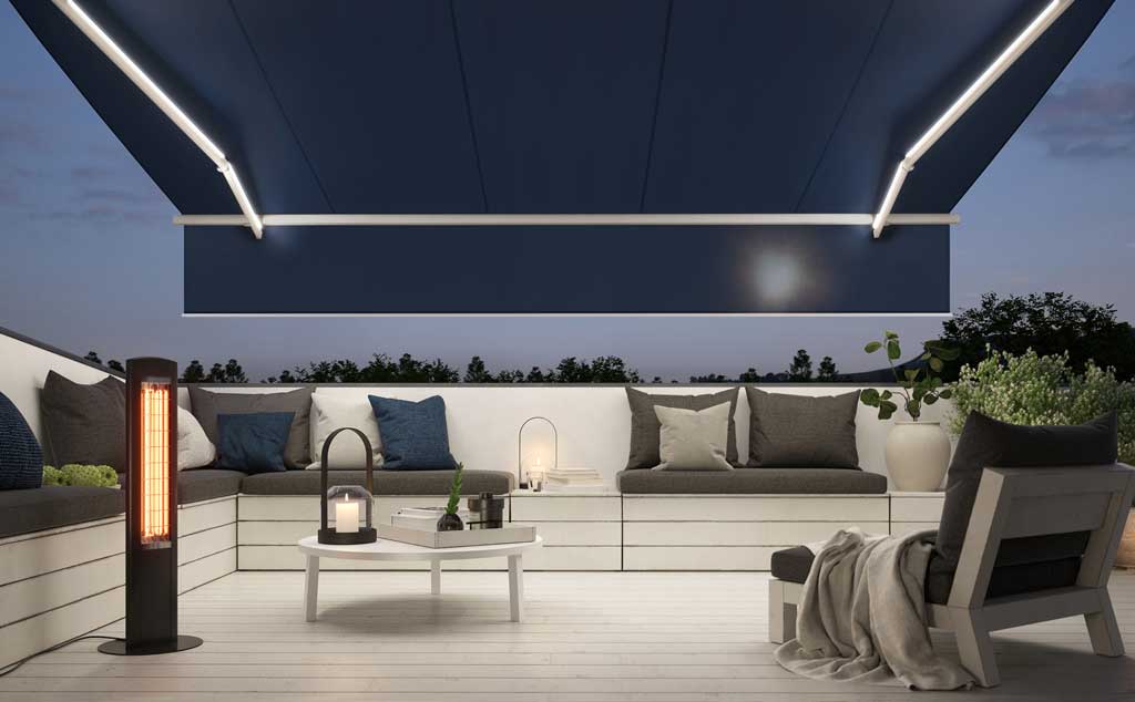 Knikarmschermen zijn niet meer alleen bedoeld als bescherming tegen de zon. Ook 's avonds bieden ze huiselijk comfort, doordat het zonweringdoek de restwarmte van de dag langer vasthoudt. Zo kun je nog uren in de buitenlucht doorbrengen. Bovendien zorgt de warme accentverlichting waarmee veel schermen tegenwoordig zijn uitgerust, voor een gezellige sfeer. Maar liefst vier modellen van zonweringproducent markilux zijn nu beschikbaar met een nieuw LED-verlichtingssysteem in de knikarmen.