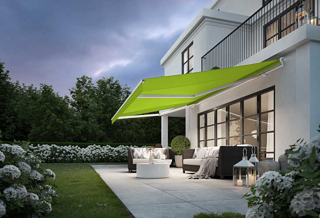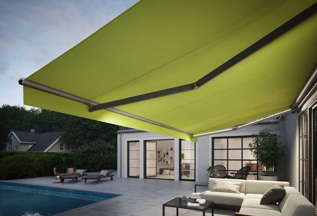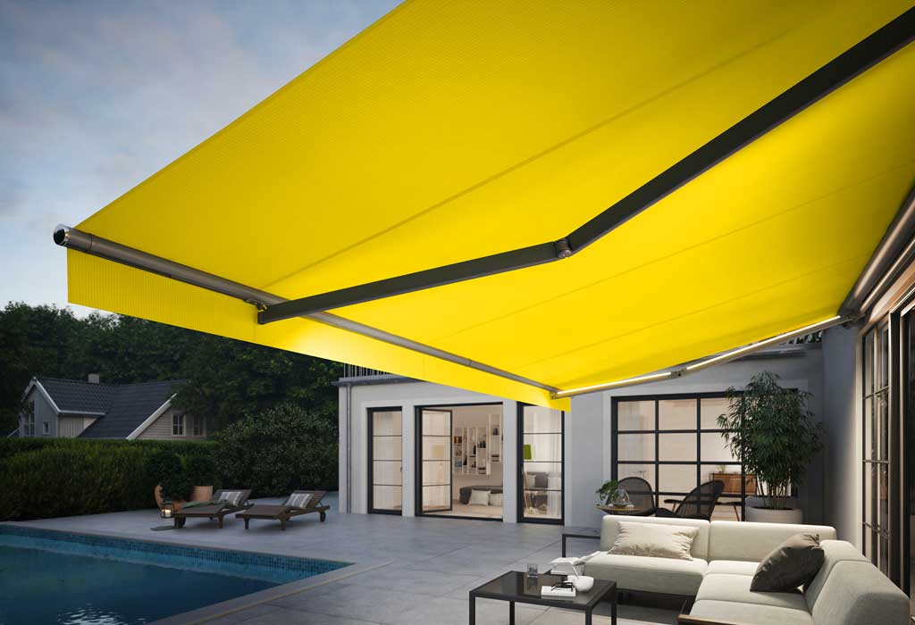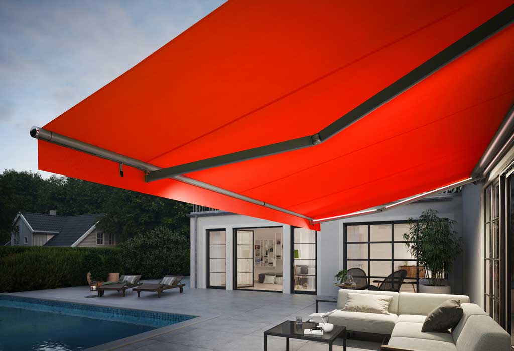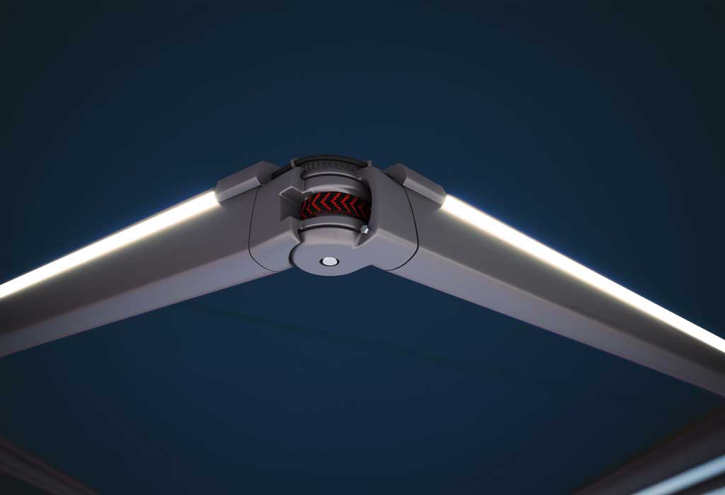 De LED-Line is aan de zijkant van de knikarmen ondergebracht. Zo schijnt het licht naar beneden en wordt het doek indirect verlicht. Hierdoor ontstaan er bijzondere lichteffecten. Afhankelijk van hoe sterk dit effect moet zijn, kan de verlichting handmatig of optioneel via io technologie (868 megahertz) worden gedimd. Het LED-systeem zit in een speciaal, wittransparant siliconenprofiel om zeer veel licht gericht te kunnen reflecteren. De LED's, die indien nodig kunnen worden vervangen, krijgen bij het bewegende middelste armscharnier stroom via elektrische kabels met kabelbescherming. Ze zitten bijna onzichtbaar in de knikarmen en zorgen voor mooie accenten aan de huismuur. De nieuwe verlichtingsoptie is dus zowel geschikt voor particulieren als voor commerciële projecten. Want er wordt een gezellige sfeer onder het scherm gecreëerd.