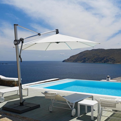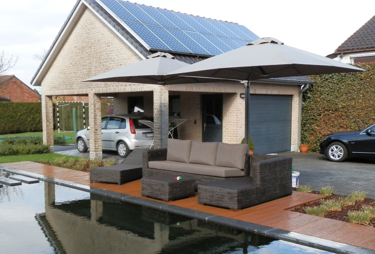 De opstelling bestaat uit een paal waaraan maar liefst tot vier parasols kunnen worden bevestigd. Via een gepatenteerde bediening compleet met gasveer worden de parasols met speels gemak ingeklapt. Nog meer luxe biedt de elektrische variant waarbij dit ‘gewoon’ via de afstandsbediening gebeurt. Leuk is ook de mogelijkheid om de voet uit te rusten met moodlights. Er kan gekozen worden voor authentieke ronde parasols of trendy vierkante. De ronde hebben een afmeting van 350 cm waar de vierkante met 250 cm of 300 cm ook niet echt bescheiden blijven. Bij een vierkante opstelling met vier parasols is er dus een gebied van ruim 36 m² gecreëerd.
