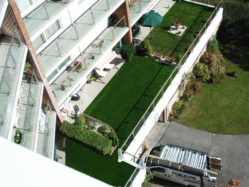 Door het eenvoudige onderhoud en de lange levensduur wordt kunstgras veel gebruikt bij hotels - Bron: www.gardengrass.com