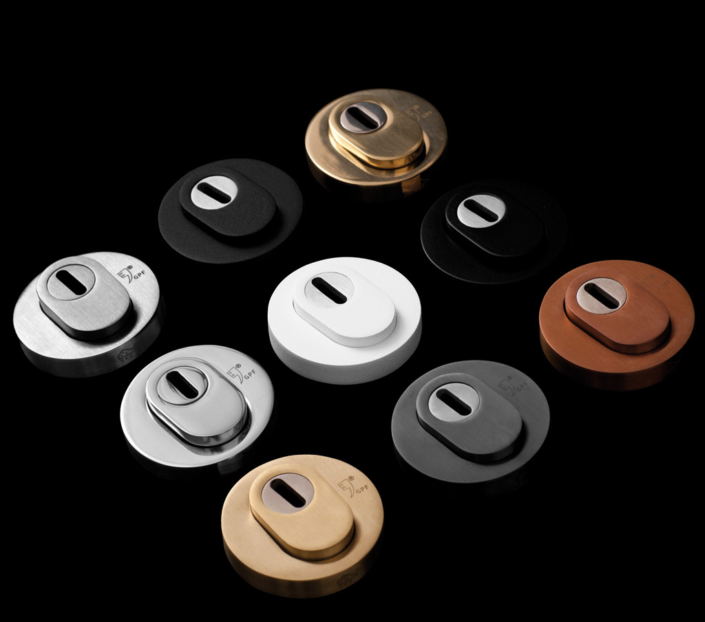 - Schilden met kerntrekbeveiliging: RVS mat geborsteld, PVD antraciet, PVD koper en PVD messing satin.