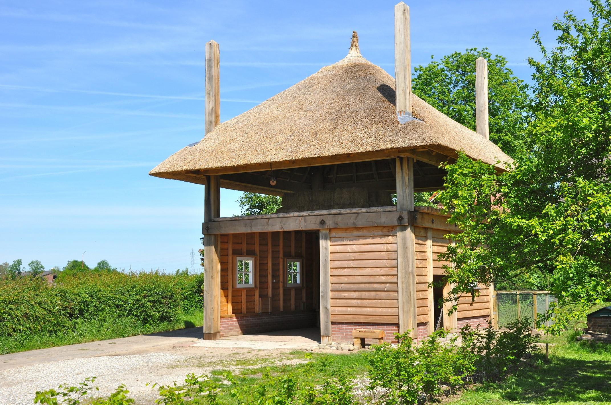 Dacht je bij de toepassing van riet alleen aan woningen? Check dan deze gave carport! Hij is gemaakt in de vorm van een hooiberg, met het typische 4-roedige dak. Aan de zijkant is ook nog een kleine schapen- en kippenstal gemaakt die uitkomt op een mooie weide. En boven de carport is ruimte onder het dak gehouden om stro en hooi droog te leggen. Het is de perfecte combinatie van de moderne en landelijke stijl.