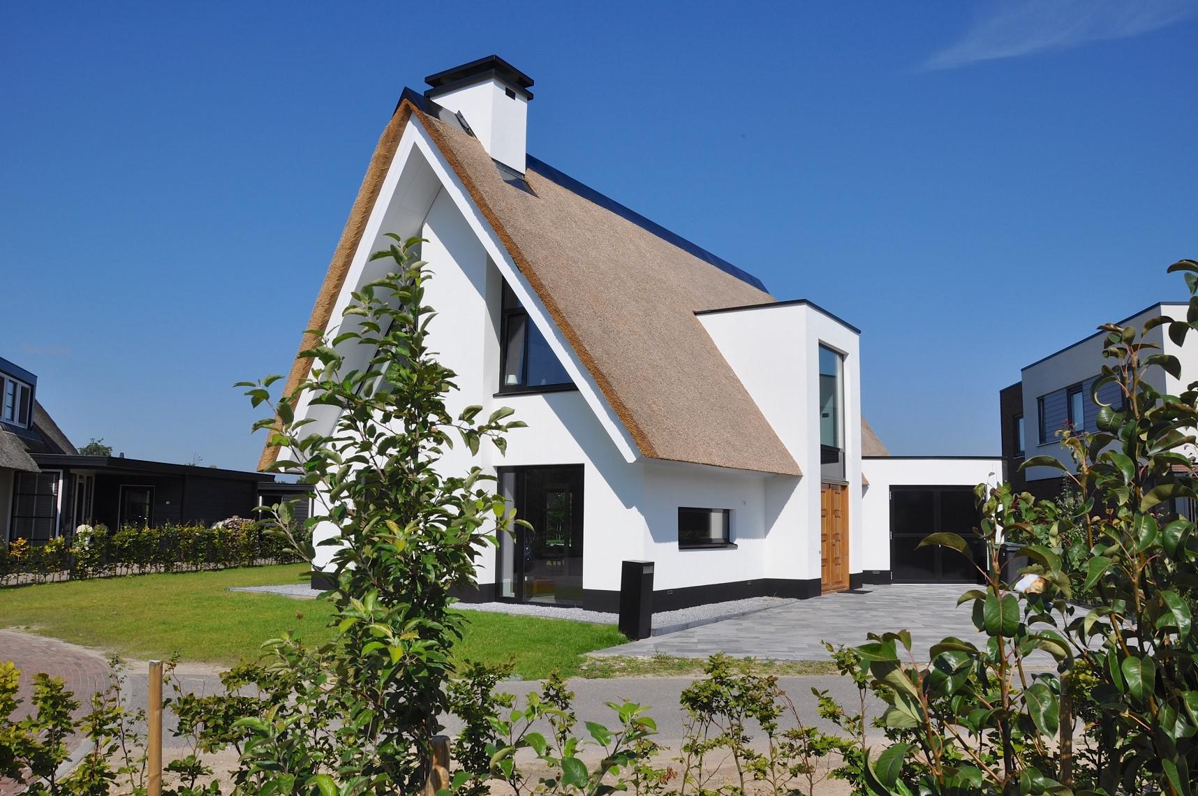 Dit strakke moderne woonhuis is voorzien van een heel bijzonder dak. Er is namelijk gekozen voor een strakke rietdekking, die op de nok is afgewerkt met aluminium. Dit is een gesloten gebonden dak, waardoor je er aan de binnenkant niets van kunt zien. Zo heb je een super modern, strak rieten dak dat prima past bij een nieuwbouw woning. Bovendien is het ook mogelijk om zonnepanelen of een zonnecollector op het rieten dak te laten plaatsen.