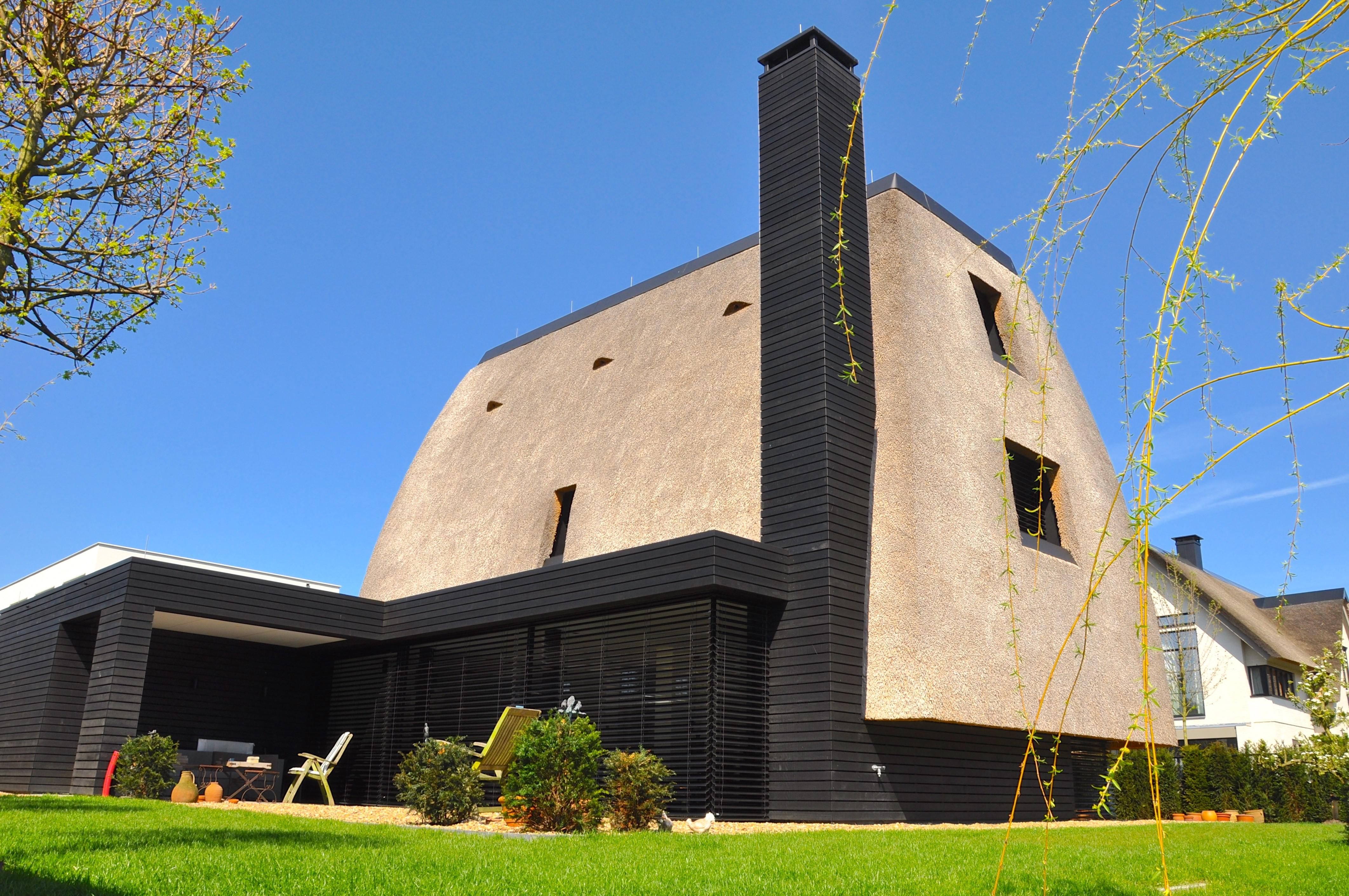 Rieten daken kennen we allemaal wel. Maar heb je ooit al gedacht aan rieten wanden? Bij dit bijzondere pand zijn de wanden grotendeels voorzien van een rieten dekking. Het is een gesloten constructie, waardoor het riet vanbinnen niet te zien is. Aan de buitenkant krijgt de woning er een heel bijzondere en moderne uitstraling van. Het riet is niet alleen mooi, maar zorgt ook voor perfecte muurisolatie.
