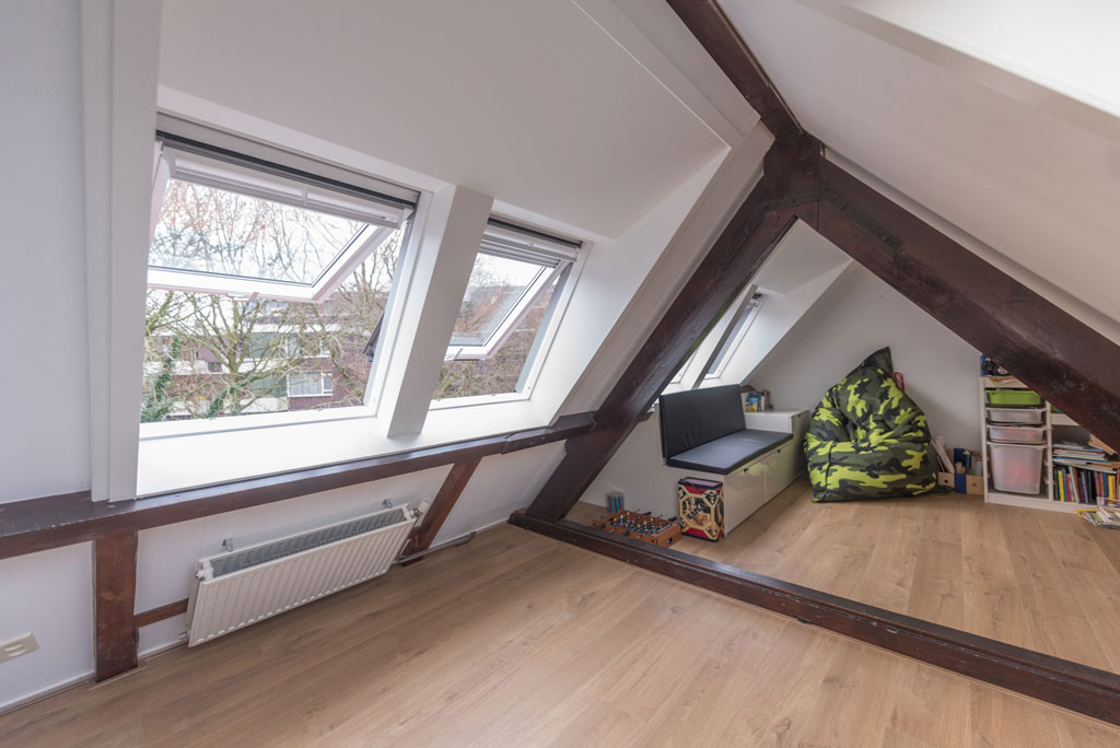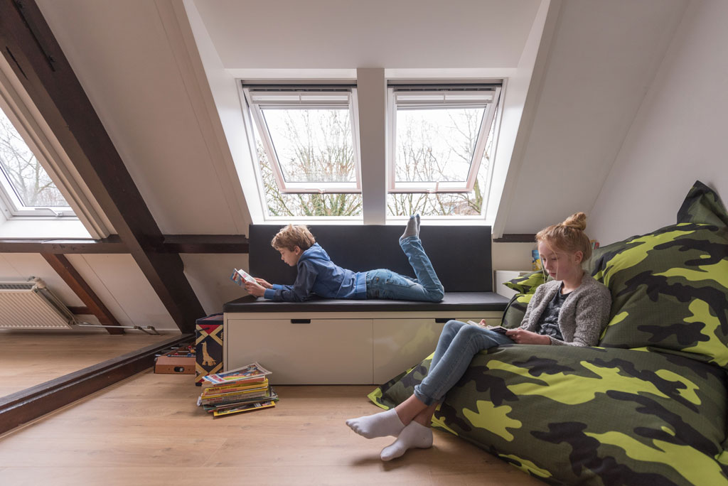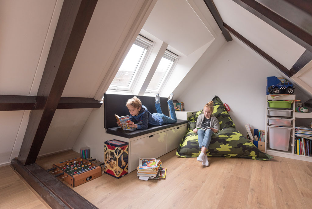 Toen de familie Bal ging verhuizen bedachten zij direct dat de rommelzolder van de vorige bewoners wel een hele mooie ruimte zou zijn voor hun kinderen. “De zolder stond vol spullen en was vrij klein, maar we zagen de potentie. We hebben twee VELUX dakkapellen geplaatst, waardoor de ruimte groter, lichter en frisser is geworden. Zonder een ingrijpende verbouwing en ingewikkeld vergunningsaanvraagtraject hebben we in een week een hele nieuwe ruimte gecreëerd. De kinderen zien het echt als hun eigen plekje. Ze kunnen er lekker rustig lezen of spelen met vrienden,” vertellen de ouders.