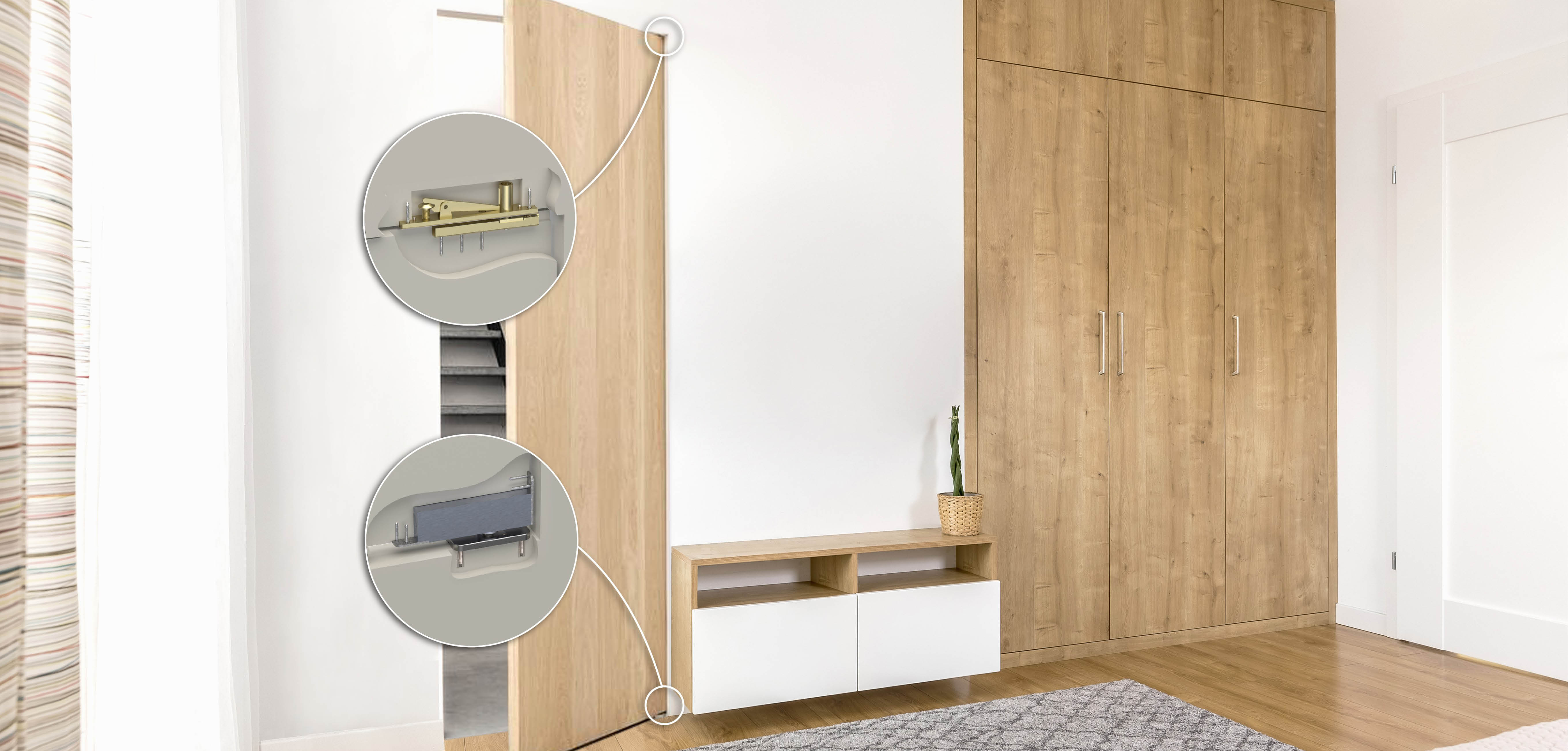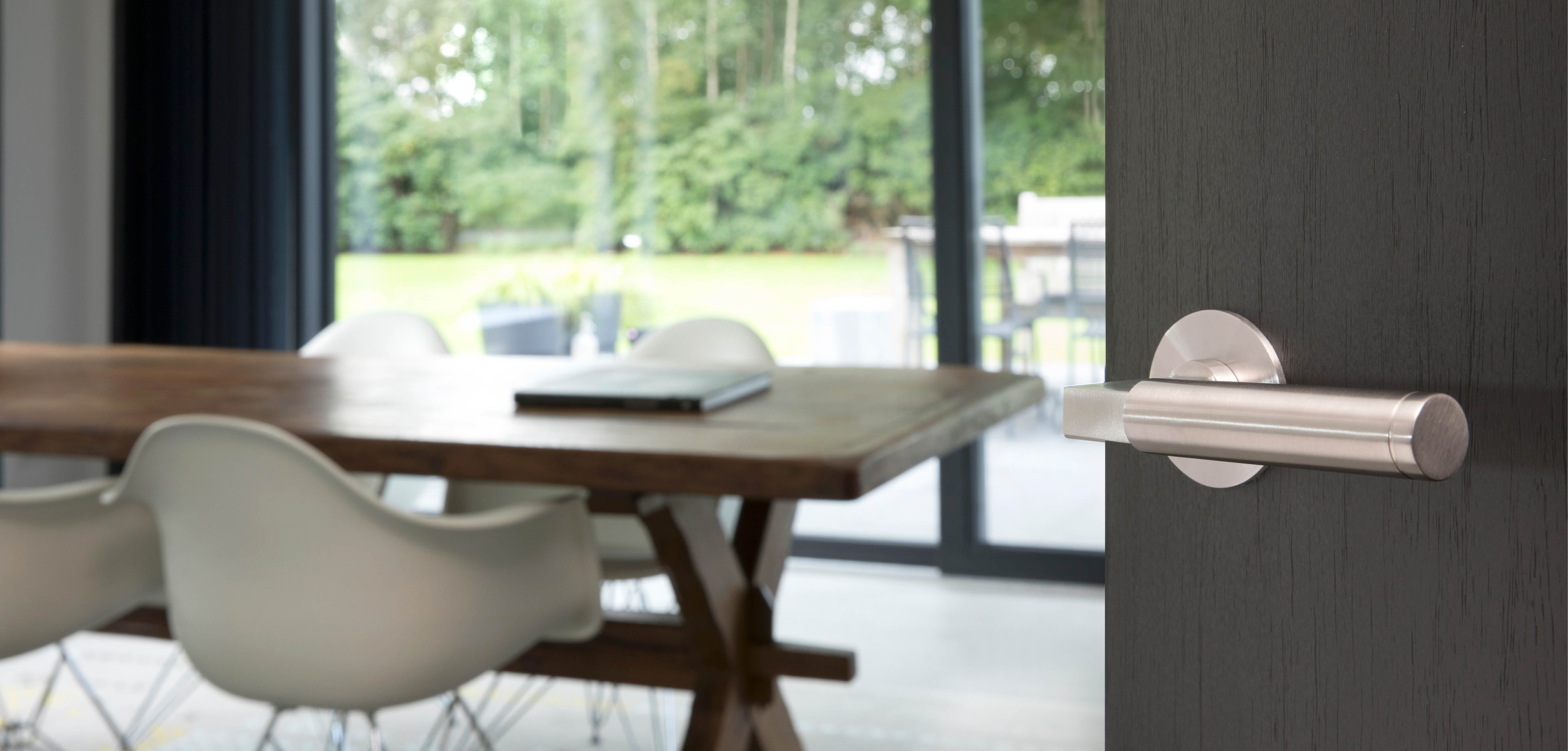 Het deurkrukgarnituur met de subtiele vlakke rozetten van slechts 3 mm dikte zijn onzichtbaar bevestigd op het deurblad. Ook zijn onzichtbare scharnieren toegepast en hebben de deursloten een magnetische dagschoot, wat niet alleen fraaier is, maar ook stiller en veiliger. Bij een geopende deur steekt er geen dagschoot uit en het sluiten gebeurt geruisloos. “Door het magneetslot is ook geen aanzet in het kozijn nodig, wat meewerkt aan dat strakke aanzicht.” vult Klunder aan.
