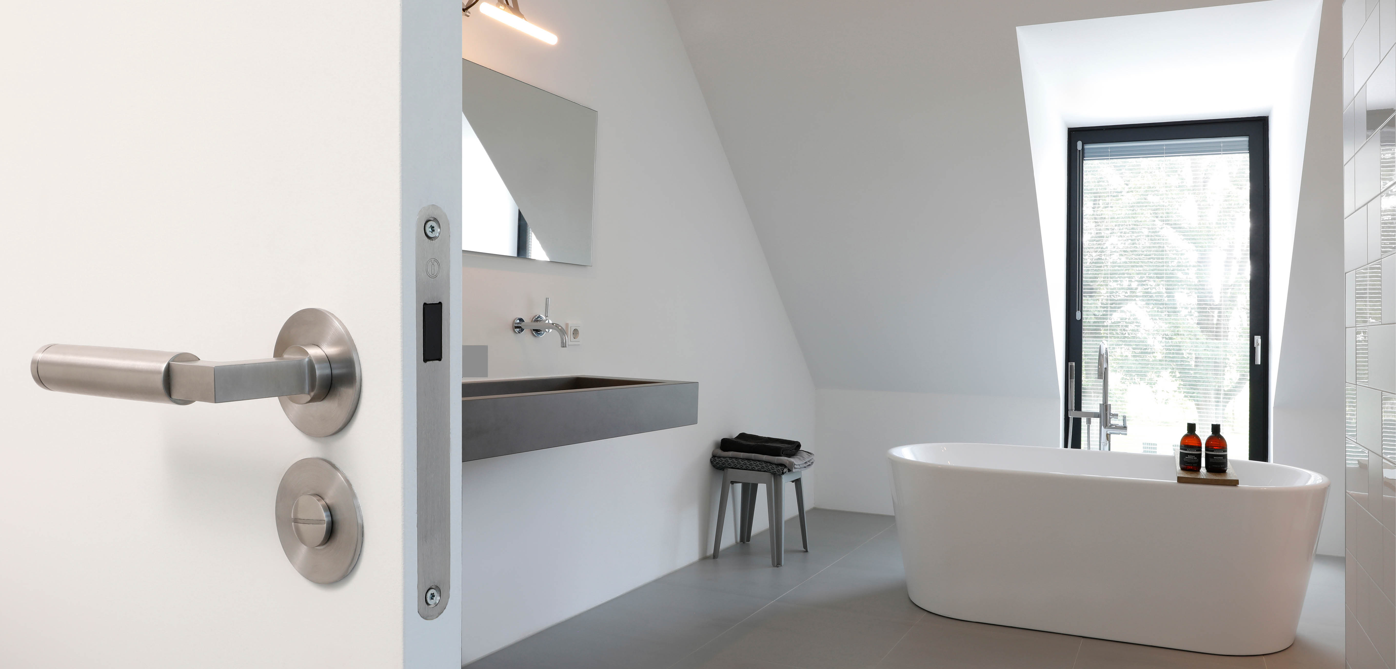“In mijn werk zoek ik vaak naar contrasten en ik probeer daarin de juiste combinatie te maken met materialen. De plafond-hoge deuren en het strakke deurbeslag zijn daar een mooi voorbeeld van”. De toepassing van dit minimalistisch vormgegeven hang- en sluitwerk, aangebracht op fraaie houten deuren in houten kozijnen, levert een verrassend subtiel en ingetogen resultaat op