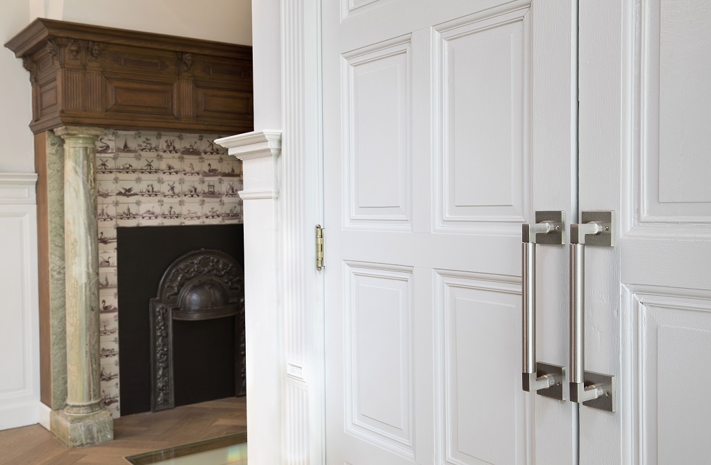 Catharina zocht samen met Maarten ter Horst, Project Adviser bij Intersteel, naar een collectie die ruimschoots aan beide bepalingen tegemoet komt. Maarten vertelt: “Catharina belde mij met de vraag of ik een advies met bemonstering kon aanleveren ten behoeve van dit project. Daarbij kwamen ook bouwkundige vraagstukken naar voren zoals het in stand houden van de oorspronkelijke details en het terugbrengen in de originele staat van deuren, kozijnen, interieurafwerking en de gevel. Ik ben gaan kijken, heb alles geïnventariseerd en op basis daarvan technisch advies uitgebracht. De keuze voor deur- en raambeslag viel na goed overleg op model Bau-stil in de afwerking messing mat nikkel. Dit past zowel qua stijl en vormgeving als techniek goed bij de villa. Er is eveneens kritisch gekeken naar de toepassing voor wat betreft inbraakveiligheid. Het gekozen beslag voldoet volledig aan de huidige inbraakpreventieregelgeving voor het verkrijgen van het PKVW certificaat.