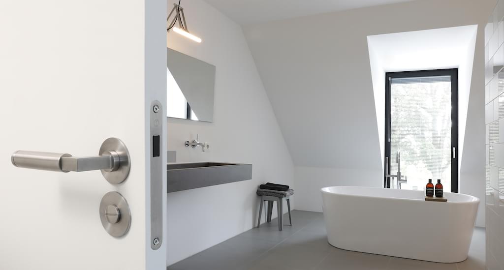 Het deurkrukgarnituur met de subtiele vlakke rozetten van slechts 3 mm dikte zijn onzichtbaar bevestigd op het deurblad. Ook zijn onzichtbare scharnieren toegepast en hebben de deursloten een magnetische dagschoot, wat niet alleen fraaier is, maar ook stiller en veiliger. Bij een geopende deur steekt er geen dagschoot uit en het sluiten gebeurt geruisloos. “Door het magneetslot is ook geen aanzet in het kozijn nodig, wat meewerkt aan dat strakke aanzicht.” vult Klunder aan. “In mijn werk zoek ik vaak naar contrasten en ik probeer daarin de juiste combinatie te maken met materialen. De plafond-hoge deuren en het strakke deurbeslag zijn daar een mooi voorbeeld van”. De toepassing van dit minimalistisch vormgegeven hang- en sluitwerk, aangebracht op fraaie houten deuren in houten kozijnen, levert een verrassend subtiel en ingetogen resultaat op.