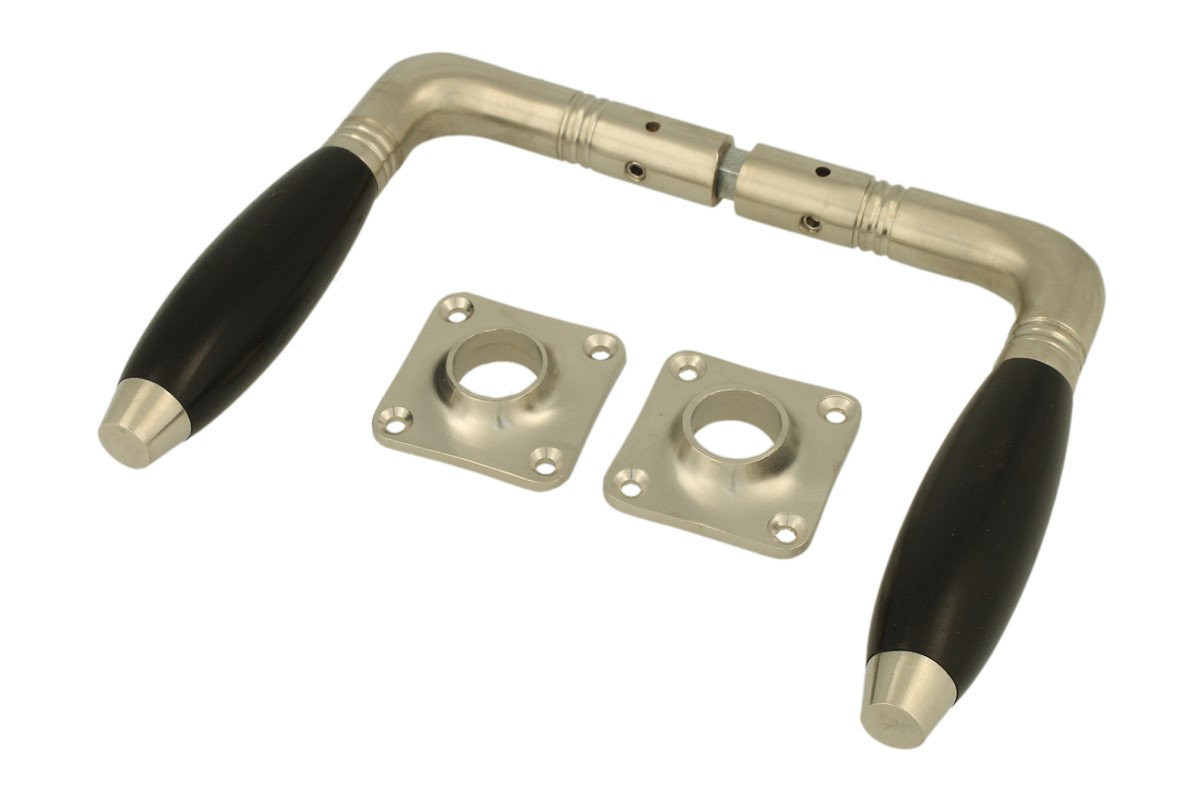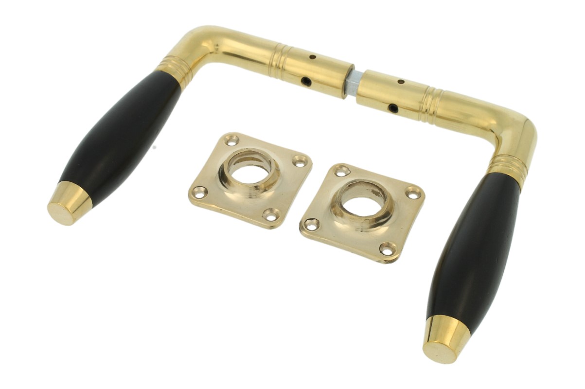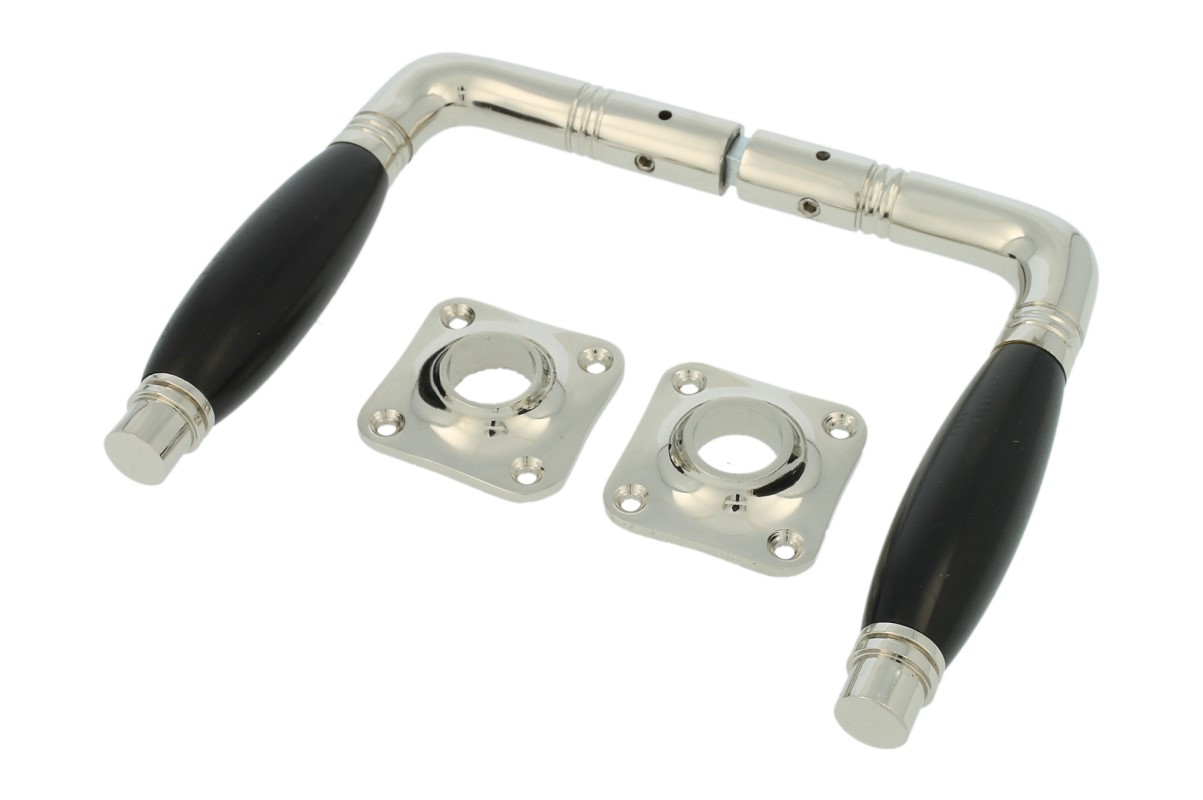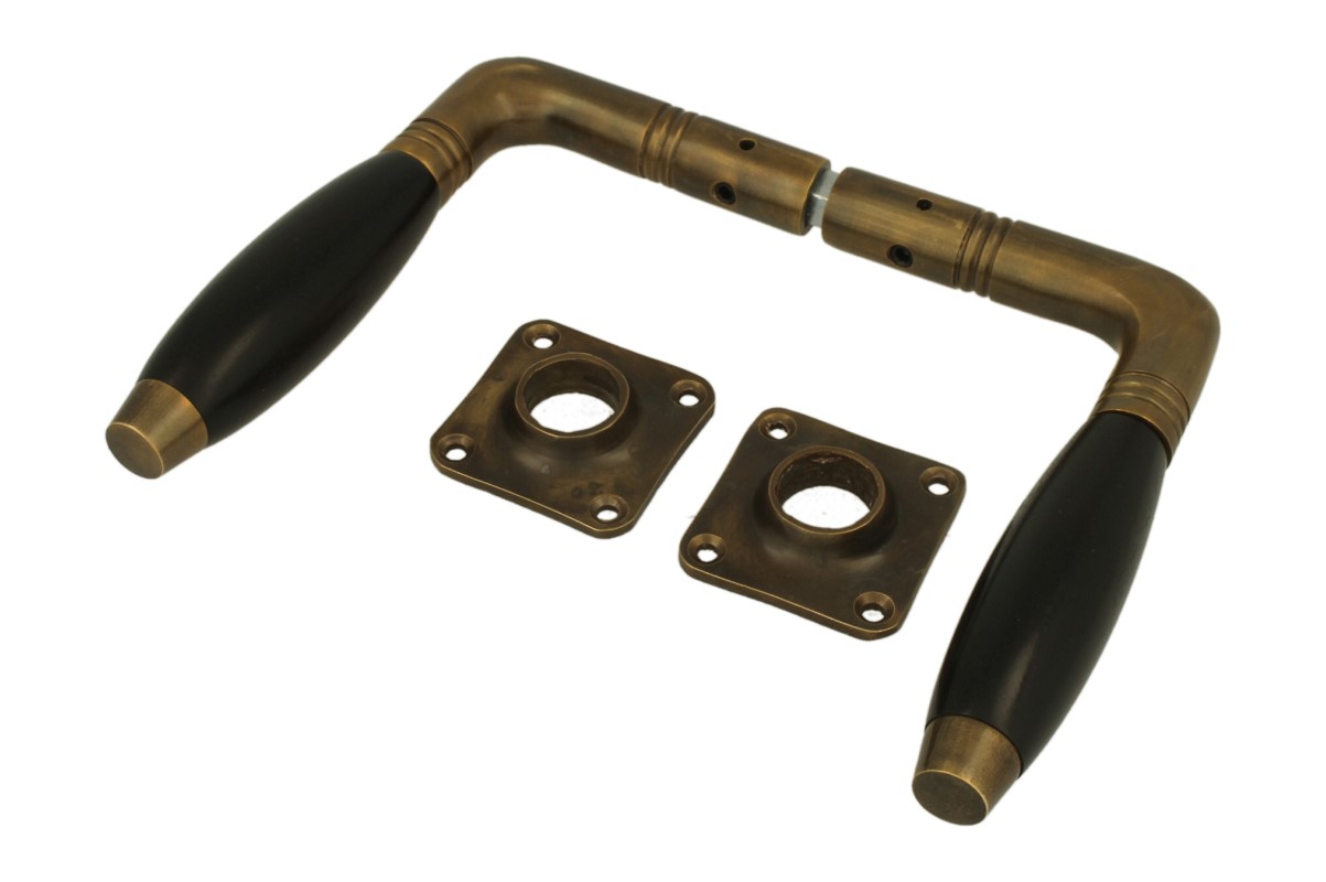 Jaren 30 tonmodel deurkruk afgewerkt met ebbenhout €33,50 voor een complete set inclusief rozetten en bevestigingsmateriaal.
