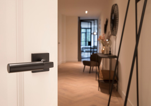 Iedere woning is uniek en heeft een lay-out die aansluit bij de vorm van het gebouw. Vanzelfsprekend voldoen de 43 appartementen aan alle comforteisen van de huidige tijd. Voor het deurbeslag heeft interieurarchitecte Saskia Roelofs-De Tombe geadviseerd om gebruik te maken van de Living Black-lijn van Intersteel. Roelofs-De Tombe: “De matzwarte Bau-stil deurkrukken passen qua stijl uitstekend bij de zakelijk-expressionistische stijl van het appartementencomplex. Ze hebben mooie rechte hoeken en een moderne zwarte finish. Het is Bauhaus, maar toch modern.” Intersteel leverde ook het zwarte veiligheidsbeslag met SKG*** keurmerk en de geborstelde rvs paumelle-scharnieren die bijdragen aan een stijlvolle, luxe uitstraling.