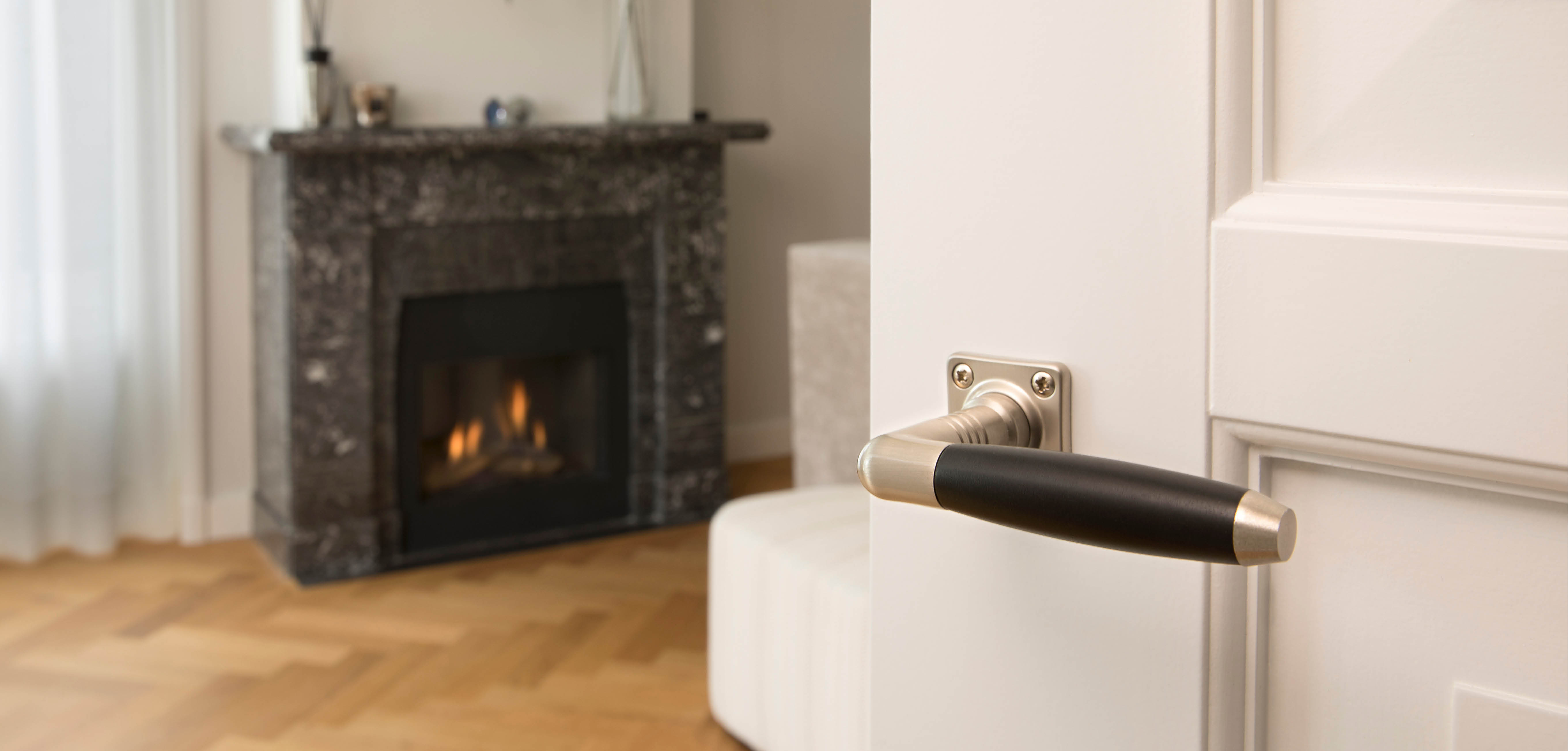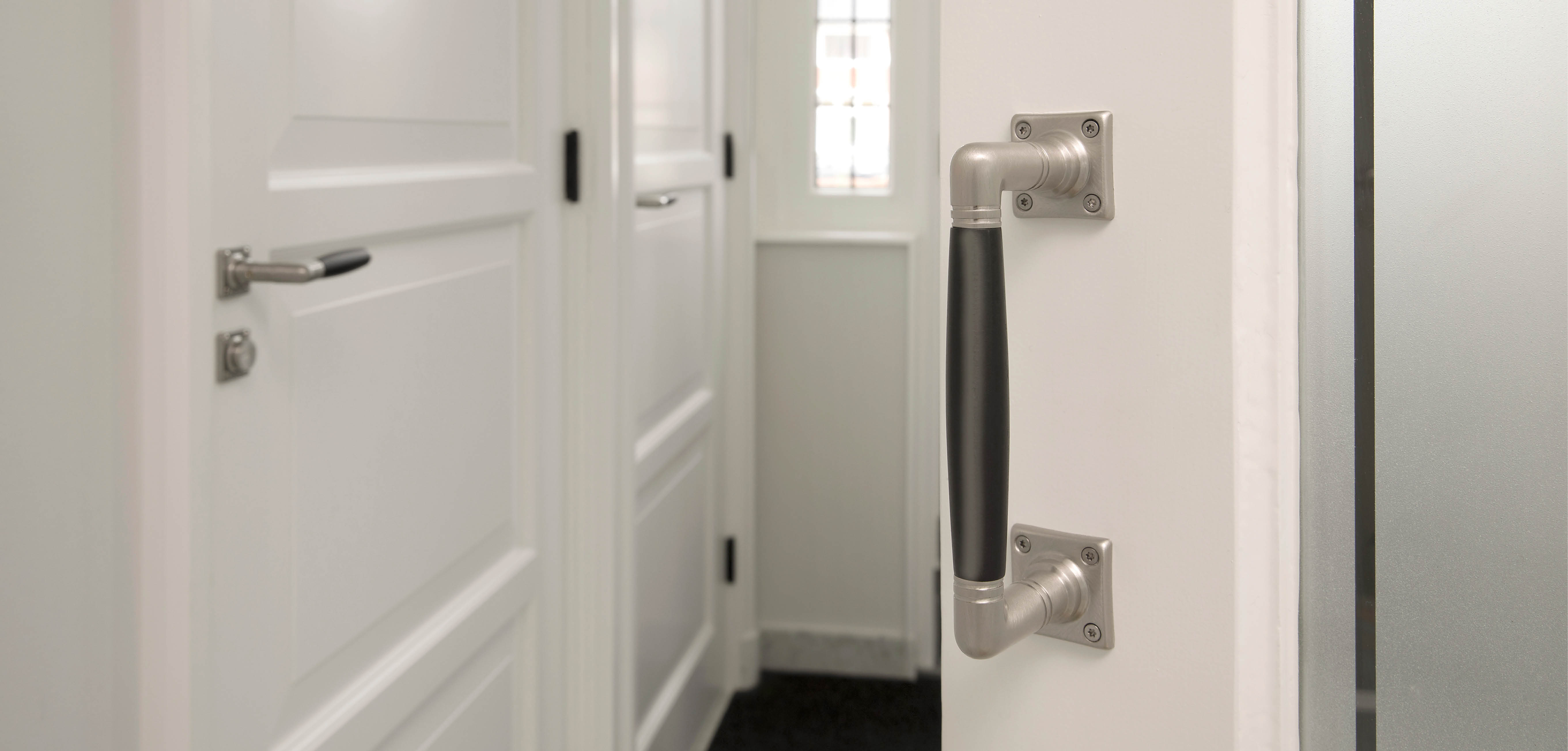 “Ook binnen moest het deur- en raambeslag passen in het tijdsbeeld waarin de oorspronkelijke stadsvilla is gebouwd” aldus Ter Horst. Daarom is gekozen voor model Ton 400. Dit raam- en deurbeslag is uitgevoerd in messing mat nikkel met ebben¬houten greep. De sleutelrozetten en wc-garnituren sluiten daar van¬zelf¬sprekend helemaal bij aan. Ter Horst: “Een prak¬tische overweging was de toepassing van magneetsloten met een rvs voorplaat op de binnendeuren. Deze afwerking waarbij de dagschoot in de deur verdwijnt zodra deze openstaat, heeft een minimalistische uitstraling, waardoor de keuze hiervoor ook uit stilistische overwegingen uitstekend combineert met het messing mat nikkel deurbeslag.”