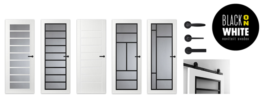 Nieuwe ontwikkelingen in deurmodellen, garnituren en schuifdeursystemen, die in het teken staan van een eigentijdse toevoeging van de kleur zwart in haar collectie. Hiermee haakt de Nederlandse deurenfabrikant op een innovatieve wijze in op de industriële interieurtrend van dit moment. Svedex laat met haar Black on White noviteiten de woonconsument ‘karakter door contrast’ creëren in het interieur door de witte Superlak® stijldeuren stijlvol en subtiel te combineren met zwarte eyecatchers. Een statement voor elk interieur of dit nu modern, landelijk of klassiek is.
