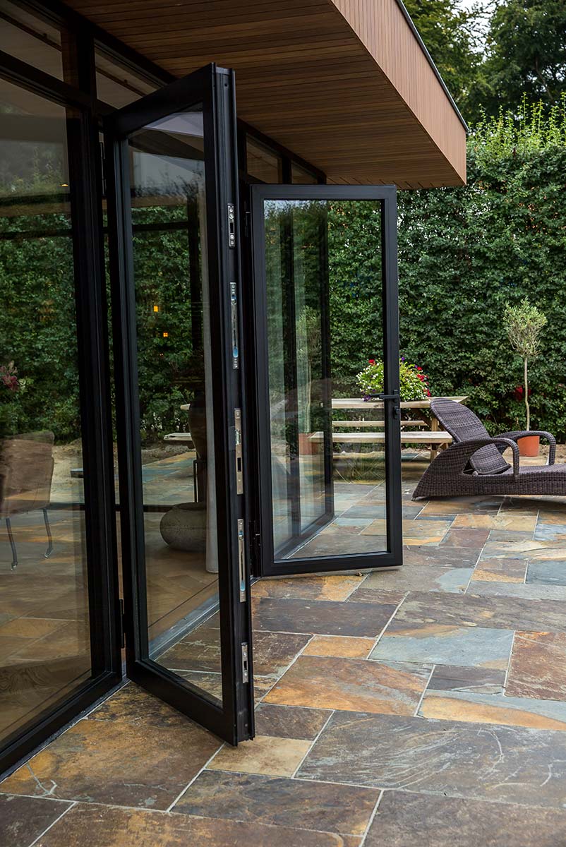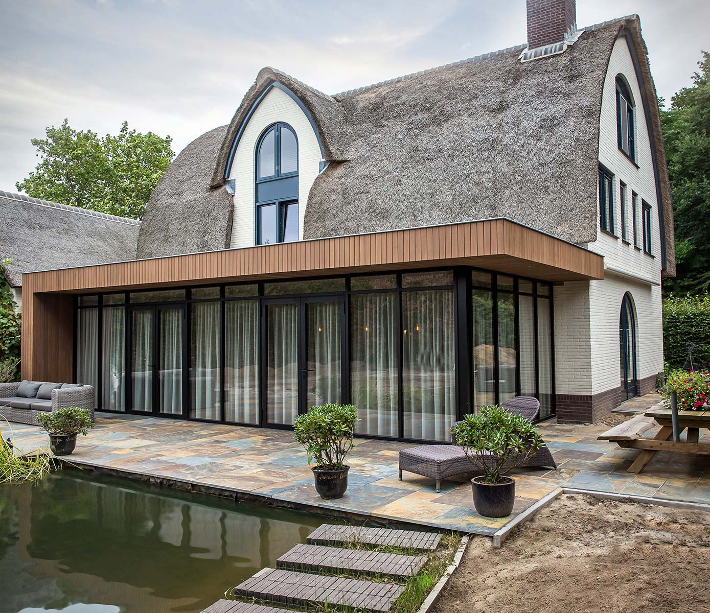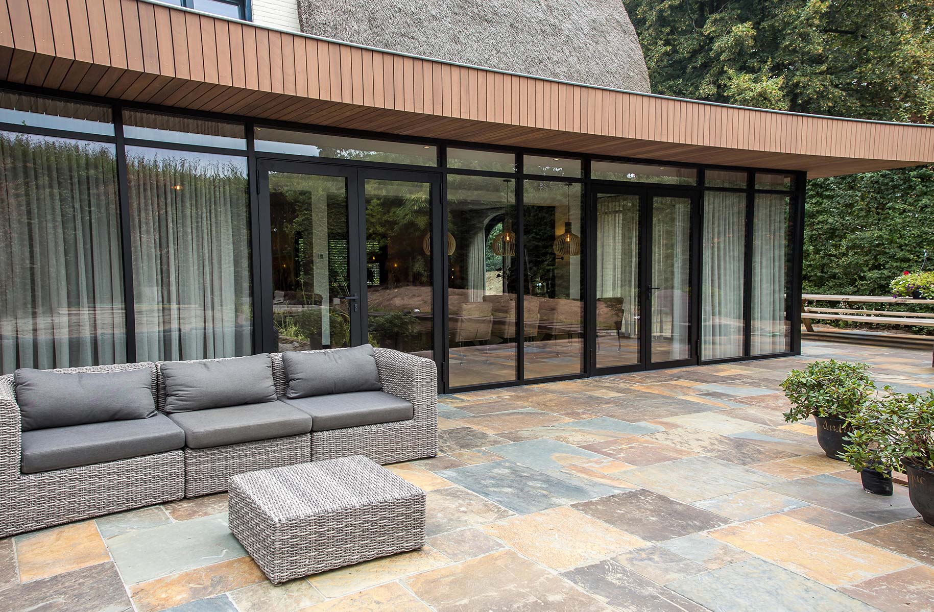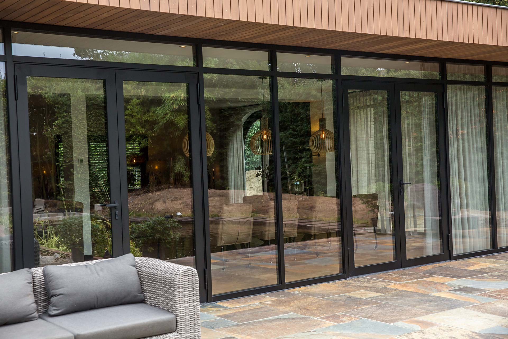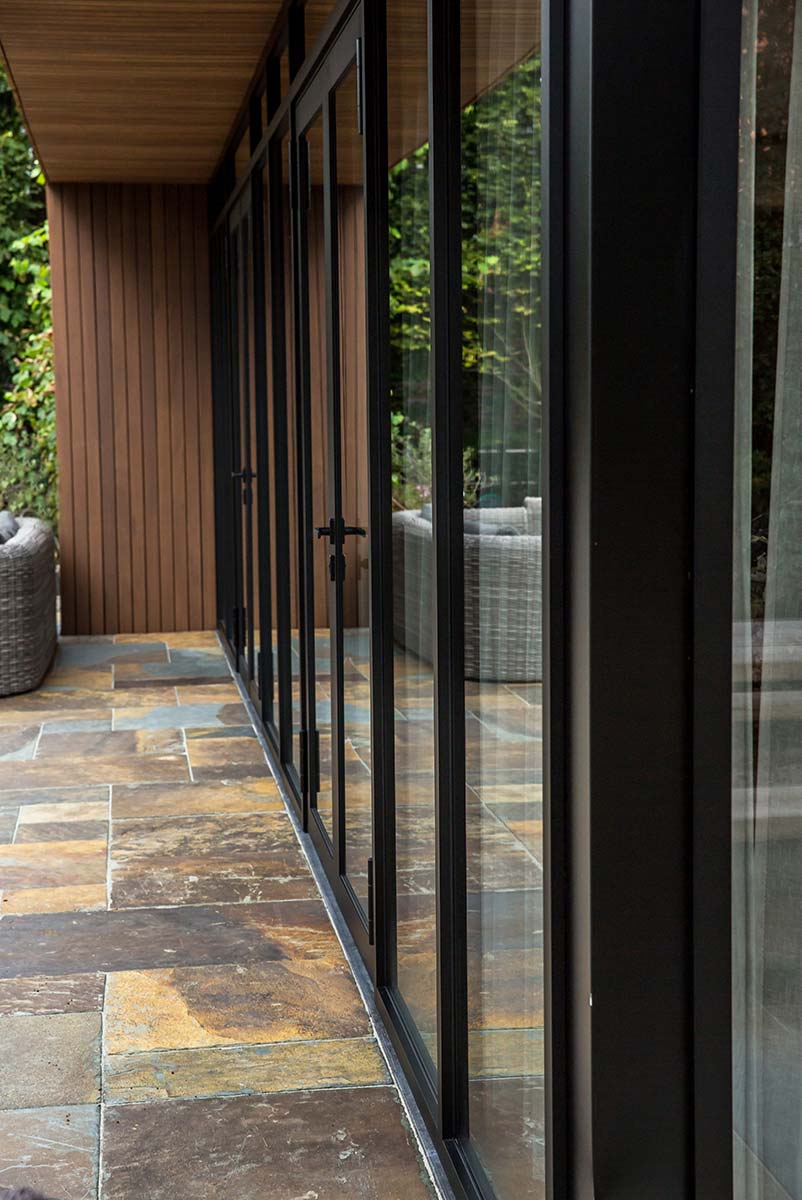 Deze steellook deuren met padoekhout maakt deze uitbouw écht een eye-catcher.