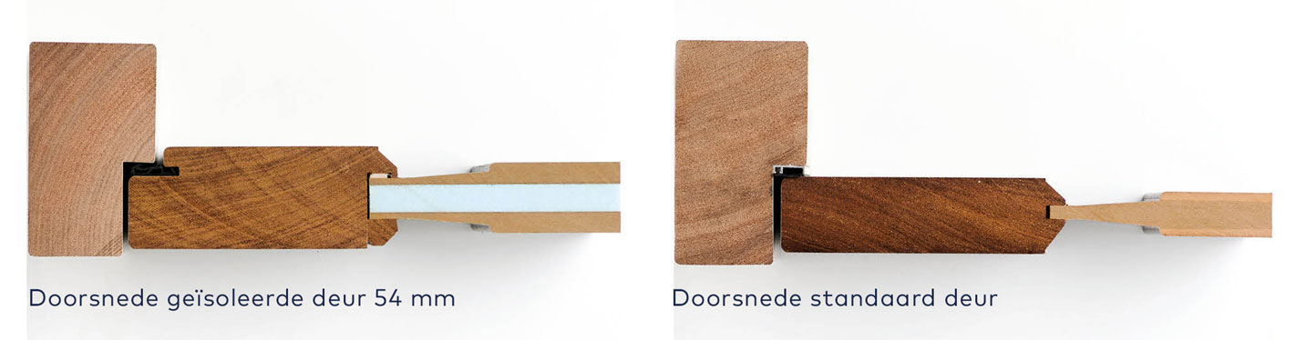 Maak je gebruik van de Weekamp Montage Service, dat biedt Weekamp jou graag de mogelijkheid jouw deuren uit te voeren in 54 mm deurdikte (standaard deur is 38 mm dik). 54 mm dikke deuren bieden tal van voordelen. Panelen hebben een geïsoleerde kern. Er is meer ruimte voor beter isolerend glas. De deuren zijn zwaarder en zeer solide en kunnen aan de randen worden voorzien van een speciale sponning waarin een High Performance kaderprofiel zorgt voor een langdurig blijvende tochtwering. Kortom: 54 mm dikke deuren zijn veilig, comfortabel en dragen bij aan een beter energielabel van jouw woning.