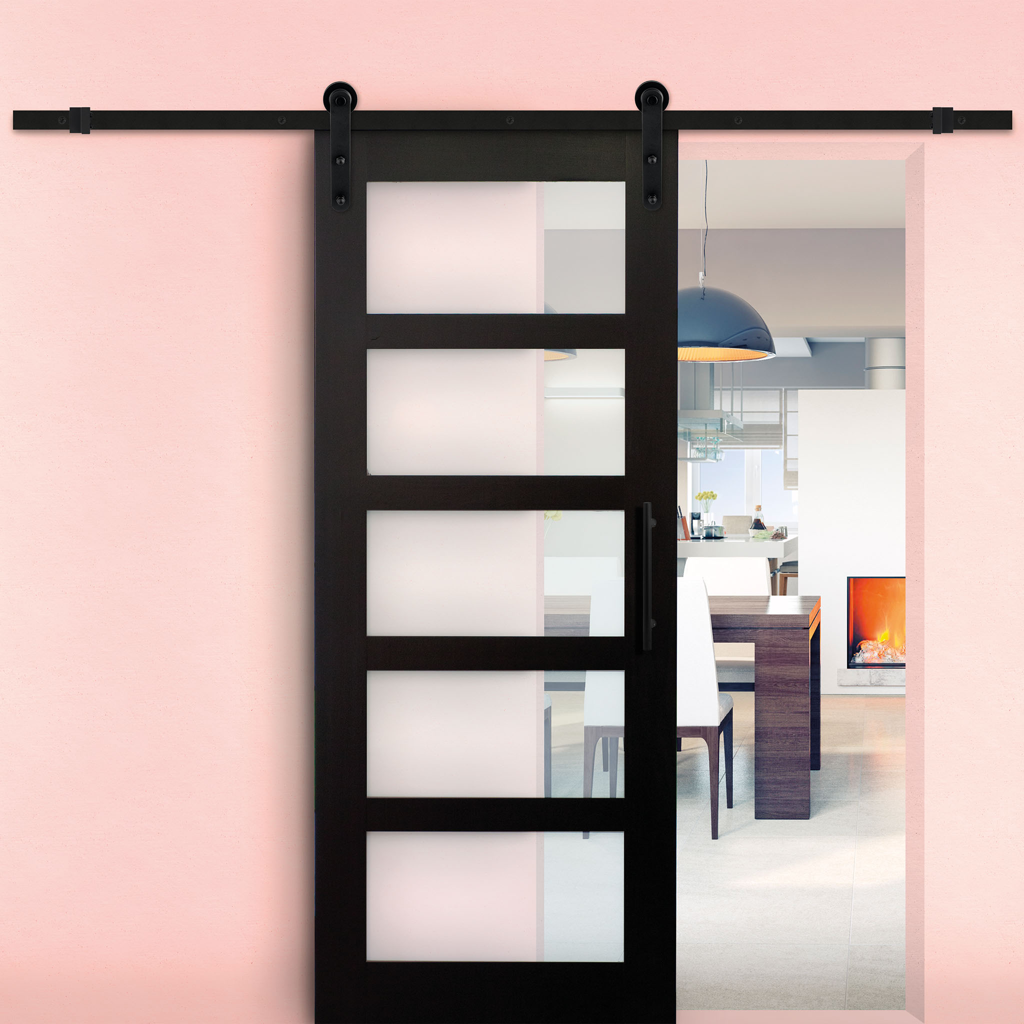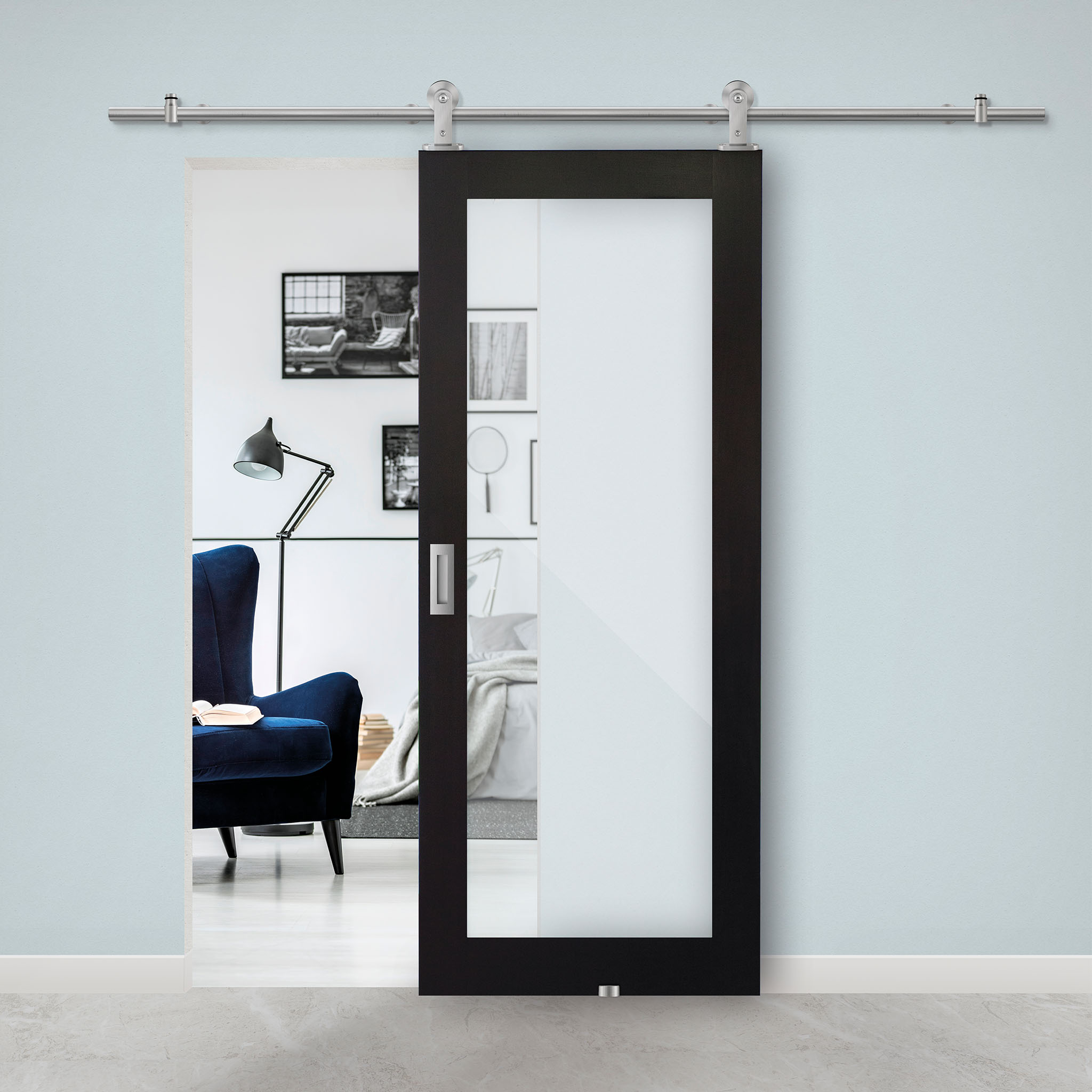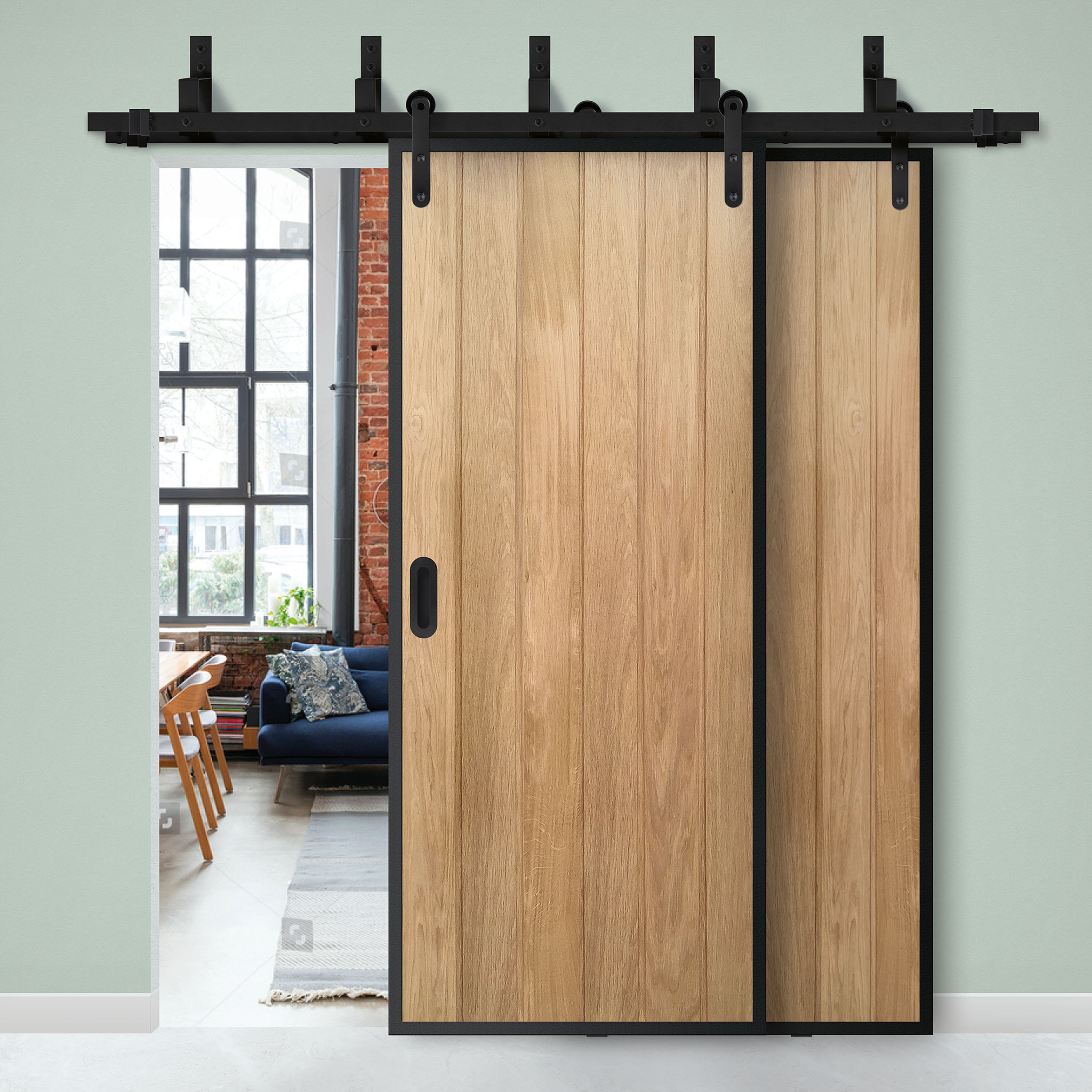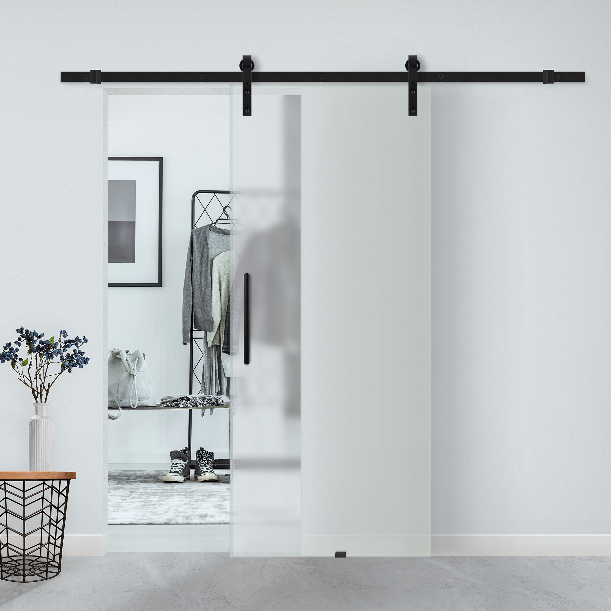 Zwart, RVS of roestkleur. Opvallende hangers of een subtiel exemplaar. Rails in verschillende lengtes. Personaliseer jouw schuifdeursysteem nu!
