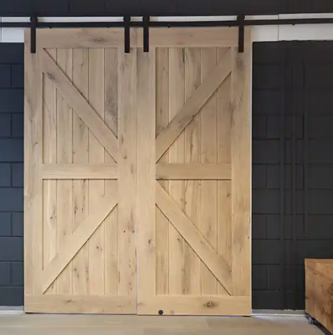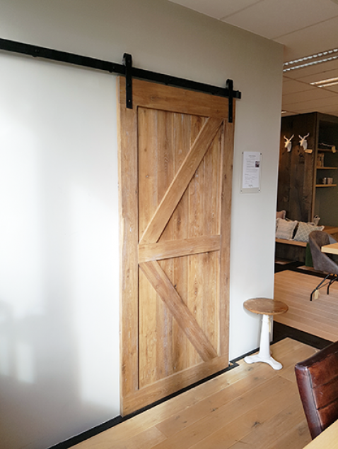 Massief houten schuifdeur met natuurlijke uitstraling. Minimalistische of industriële trends in interieurs zie je momenteel terug in veel woningen.