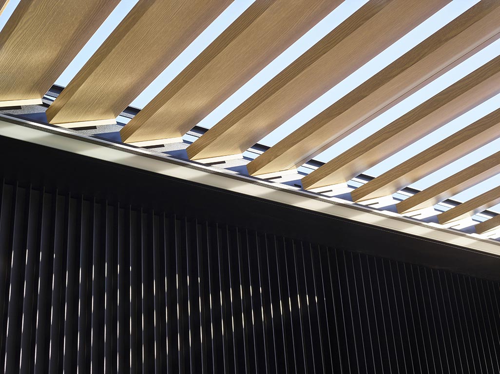 Design gevelbekleding, ook op het terras: Naast de aankleding van een woning, is Linarte ook op het terras op zijn plaats voor wie dezelfde strakke verticale belijning daar wil doortrekken. Onder een terrasoverkapping van Renson kan de design gevelbekleding perfect geïntegreerd worden in één of meer vaste wanden in de structuur met lamellendak.