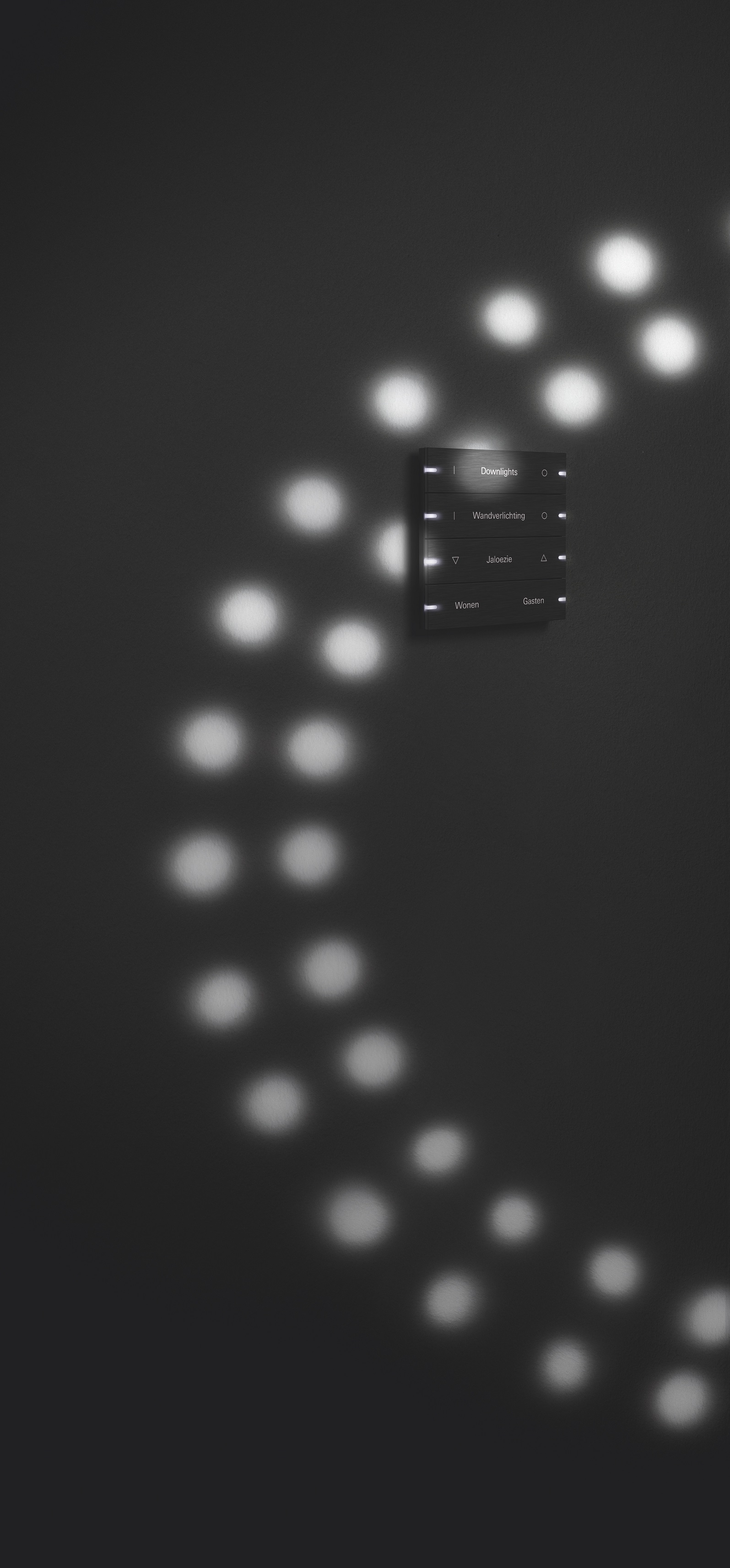 De tastsensor is verkrijgbaar met 1 tot 4 touch schakelaars. De led voor de statusweergave beschikt over acht kleurinstellingen en kan van individuele opschriften worden voorzien. De tastsensor kan met de telefoon, tablet en handmatig worden bediend.