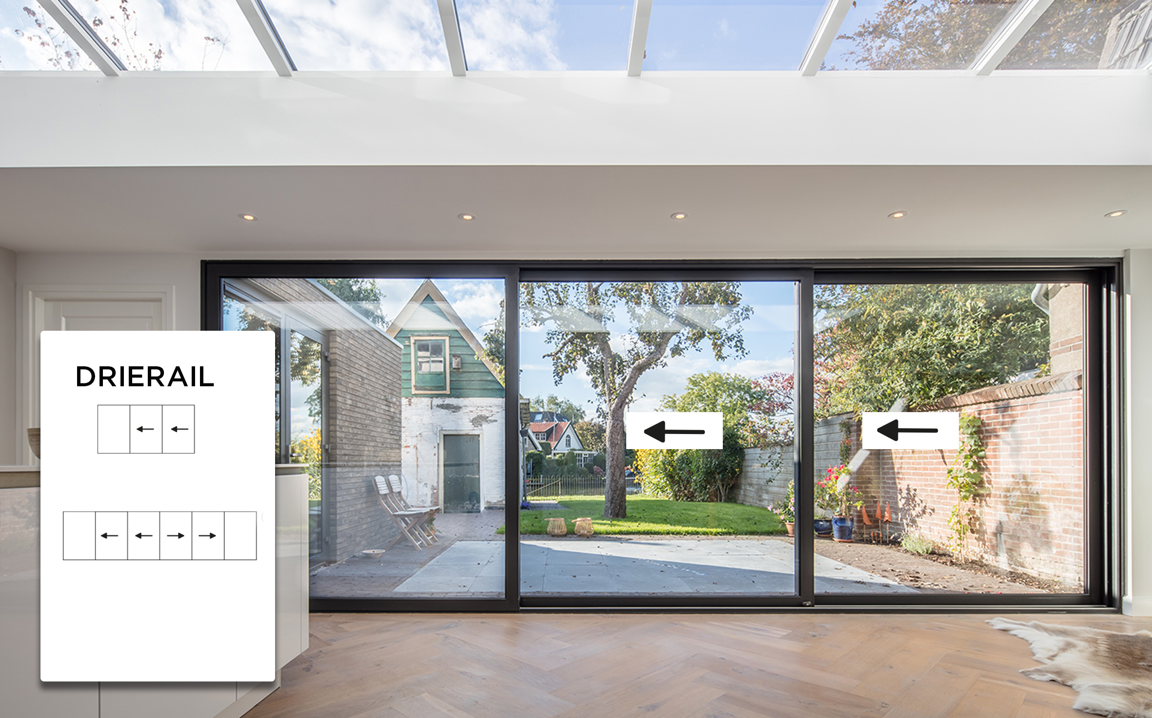 Kies voor een drierail als je een maximale doorgang naar buiten wil. De schuifpui bestaat dan uit drie vleugels waarvan er twee volledig kunnen opgeschoven worden. Of zelfs uit 6 vleugels waar de middelste delen elk naar een andere kant schuiven.