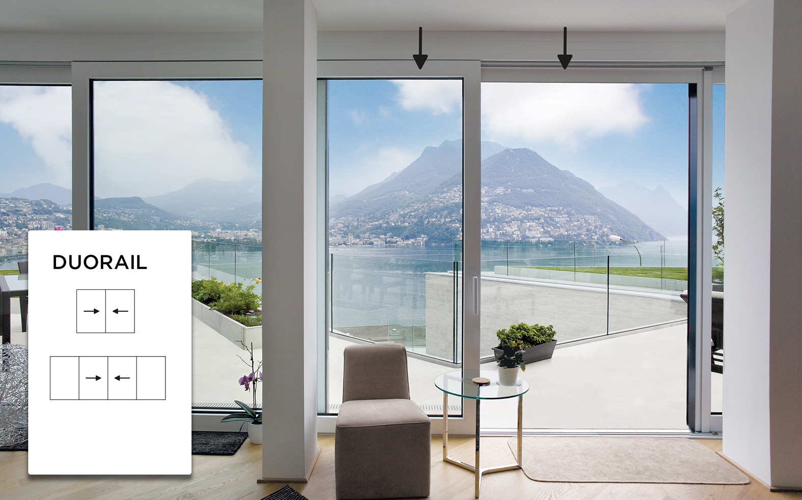 Bij een duorail heb je twee vleugels waarvan je er één of beiden kan laten schuiven. De identieke vleugels hebben hier dezelfde kaderbreedte. Dit geeft een meer symmetrisch uitzicht. Je schuifpui kan uit 2, 3 of 4 delen bestaan.