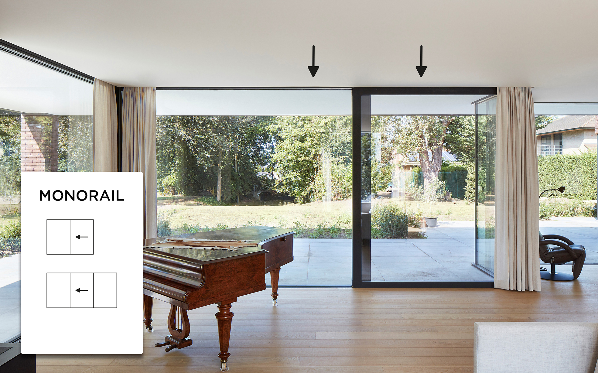 Kies voor een monorail indien je maar 1 verschuifbaar deel wil. Het vast deel is dan steeds even groot of groter dan het openschuivende deel. Een monorail schuifpui heeft maar één rail. Zo heb je een vast kader met een smal profiel en oogt je raam strak en minimalistisch. Dankzij het smalle profiel geniet je van een maximale lichtinval.