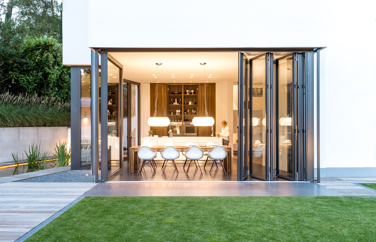 De woonkamer van deze hoekwoning is door de uitbouw omgebouwd tot een lichtovergoten moderne ruimte. Het glazen dak en vouwwanden met zeer slanke profielen zorgen voor transparantie en laten binnen en buiten echt met elkaar versmelten. De 6-delige, super goed geïsoleerde vouwwand kan over de volledige breedte worden geopend.